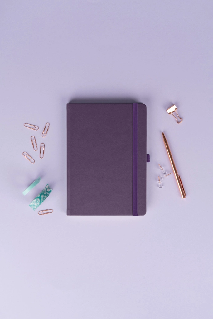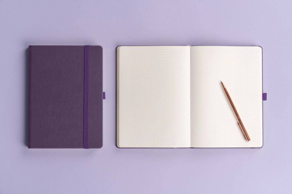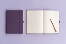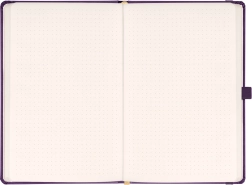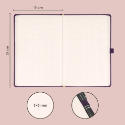 Стилен тефтер с точкова решетка NOTIQUE Aprint Neo в лилав цвят комбинира класика и елегантност. Има фино текстуриран повърхностен слой, върху който лесно може да се щампова фирмено лого, и практичен формат 15 × 21 cm за ежедневни записки, планиране и скициране.