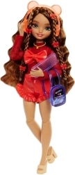 Куклата има дълга кестенява коса, украсена с червени панделки, което подчертава нейния характерен стил и ярка индивидуалност.