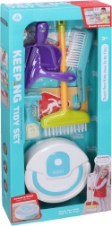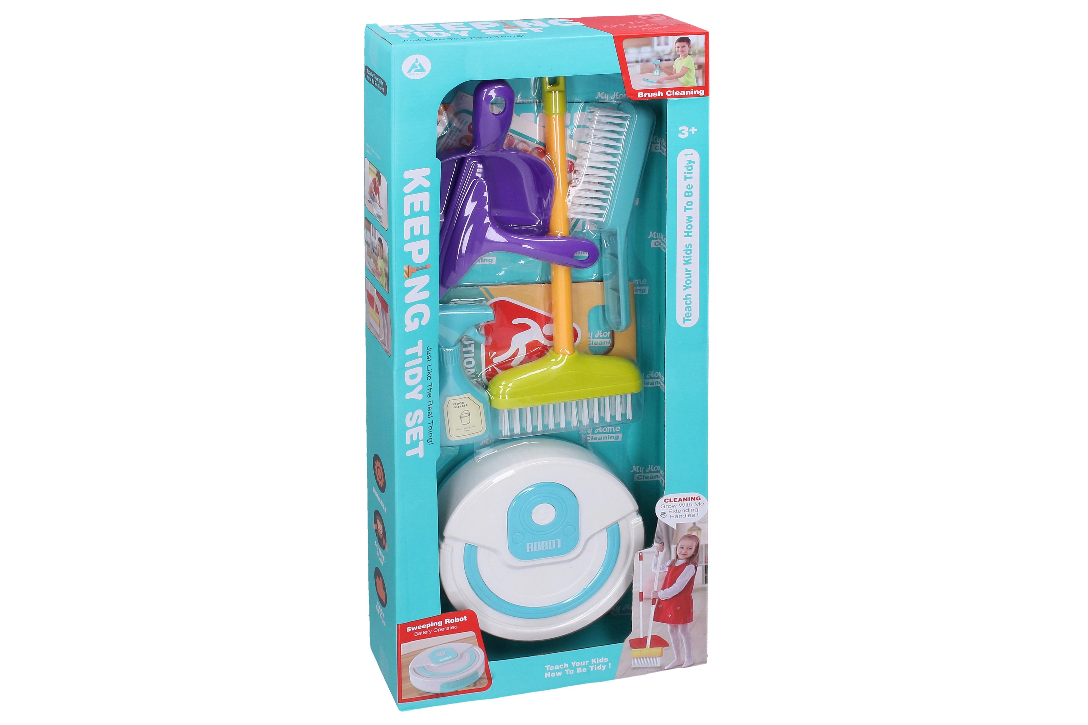 Забавен комплект за почистване за деца, който съдържа всичко необходимо за игра по време на почистването – от роботизирана прахосмукачка до табела с предупреждение за мокър под.