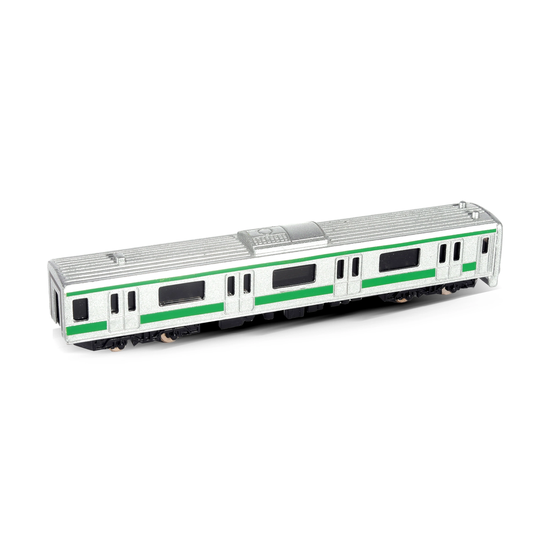 Сребърно тяло със зелени ивици, детайлни прозорци и врати – моделът изглежда като истински вагон на метрото в мащаб 1:48.