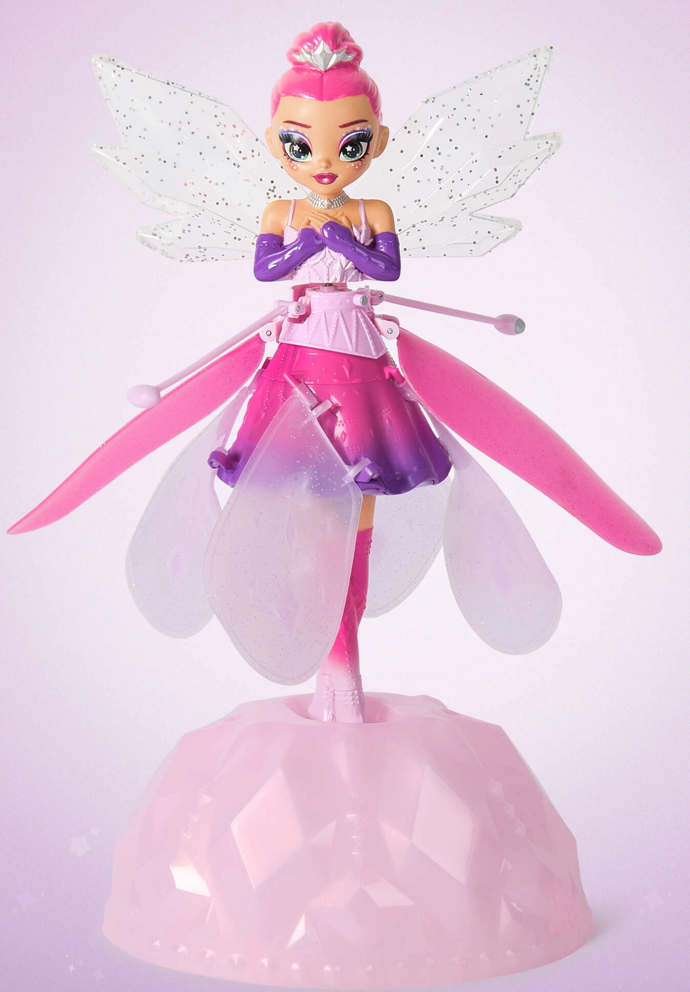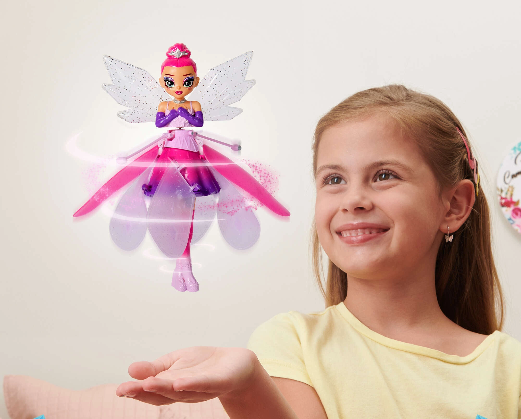 Летящата кукла HATCHIMALS Crystal Flyers превръща всяка стая в магична сцена. След включване феята се завърта и елегантно излита. С помощта на вградените сензори за движение тя реагира на ръцете ви, така че лесно можете да я насочвате във въздуха и да я оставите да танцува над дланите. Изработена е от издръжливи и безопасни материали, които издържат на ежедневна игра.