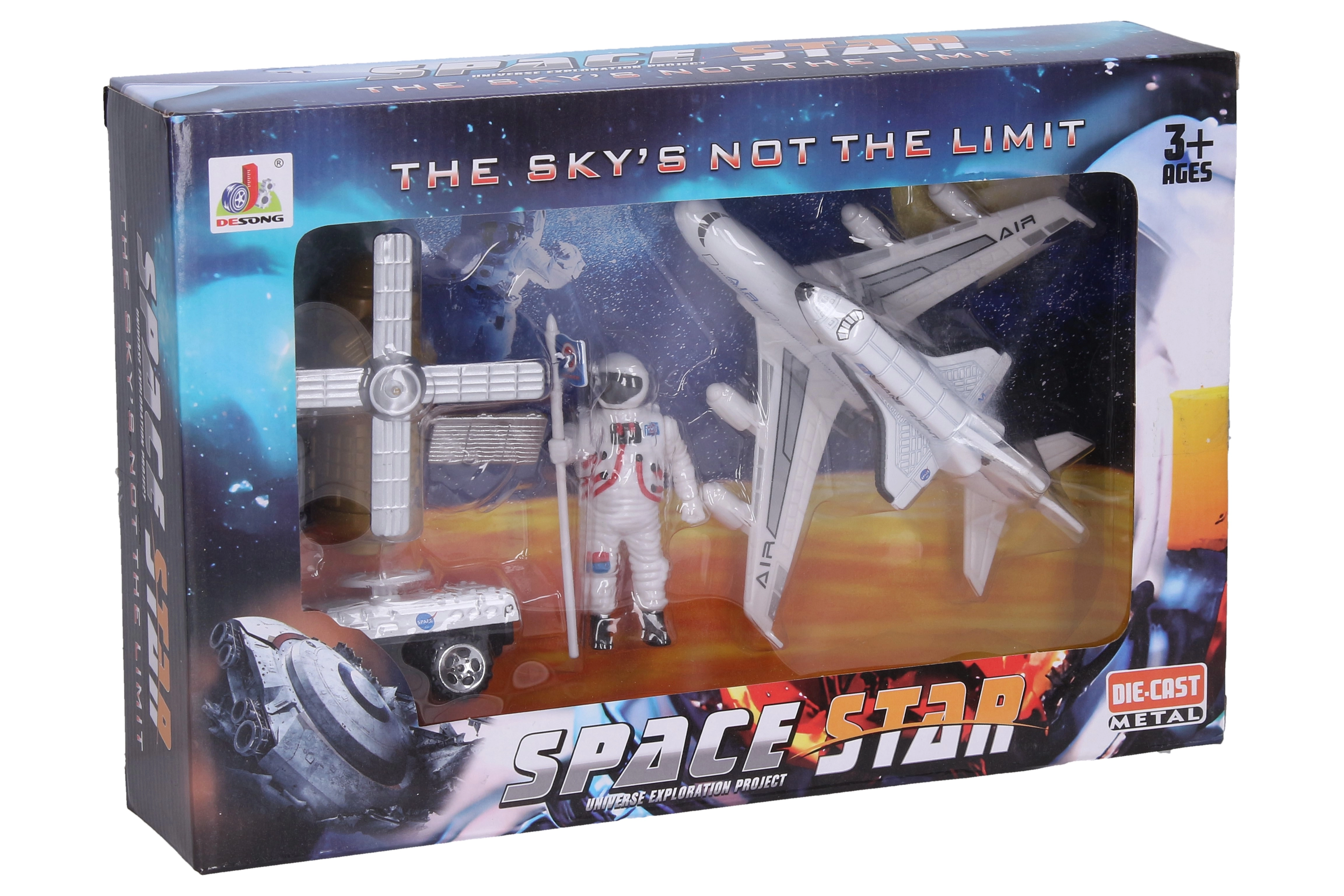 Този 5-частов космически комплект Space Star носи на децата автентичната атмосфера на космическите мисии. Качествените die-cast метални елементи в комбинация с издръжлива пластмаса осигуряват здравина и дълъг живот. Децата могат да симулират изстрелване на ракета, кацане на Луната и зареждане с гориво.