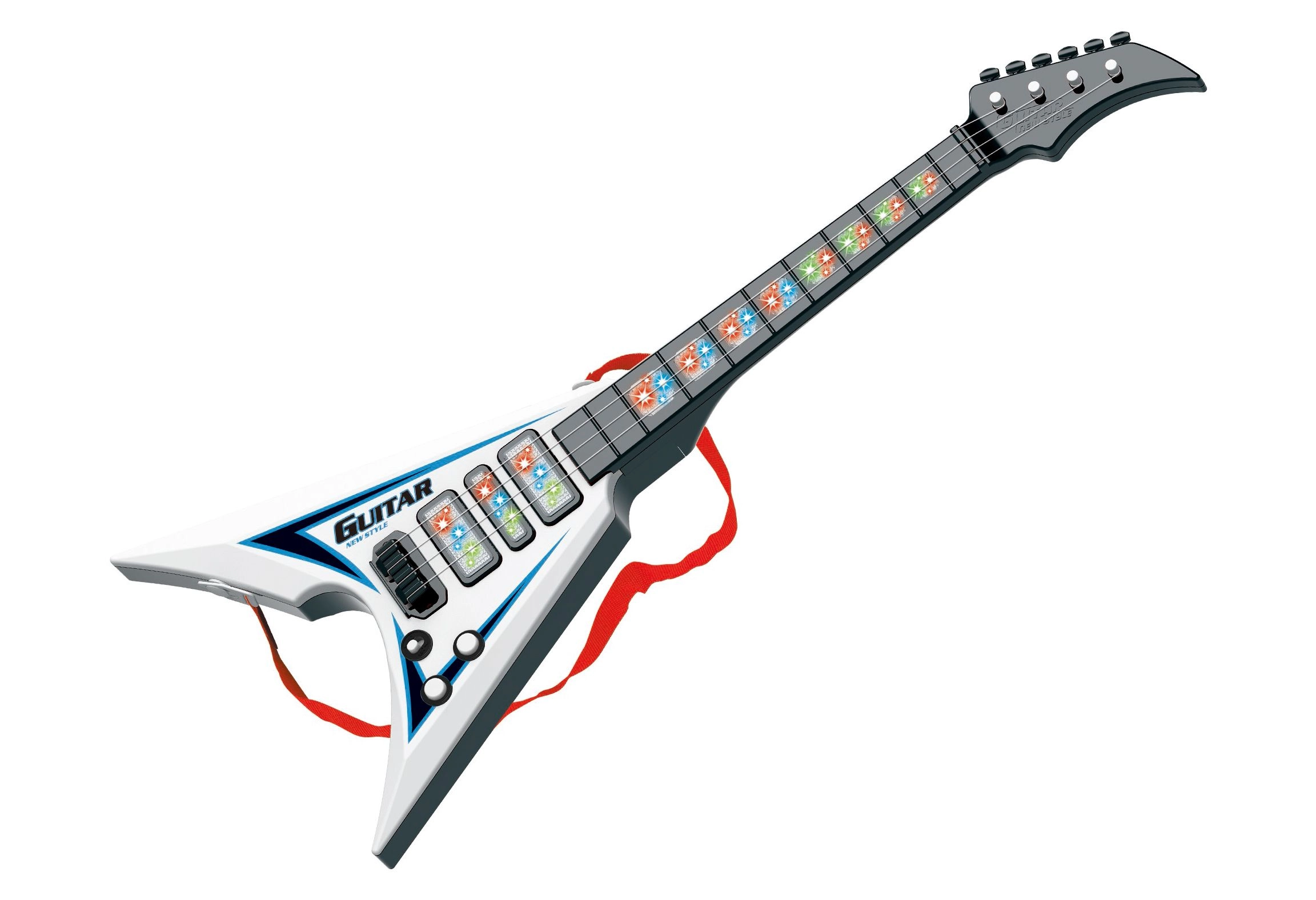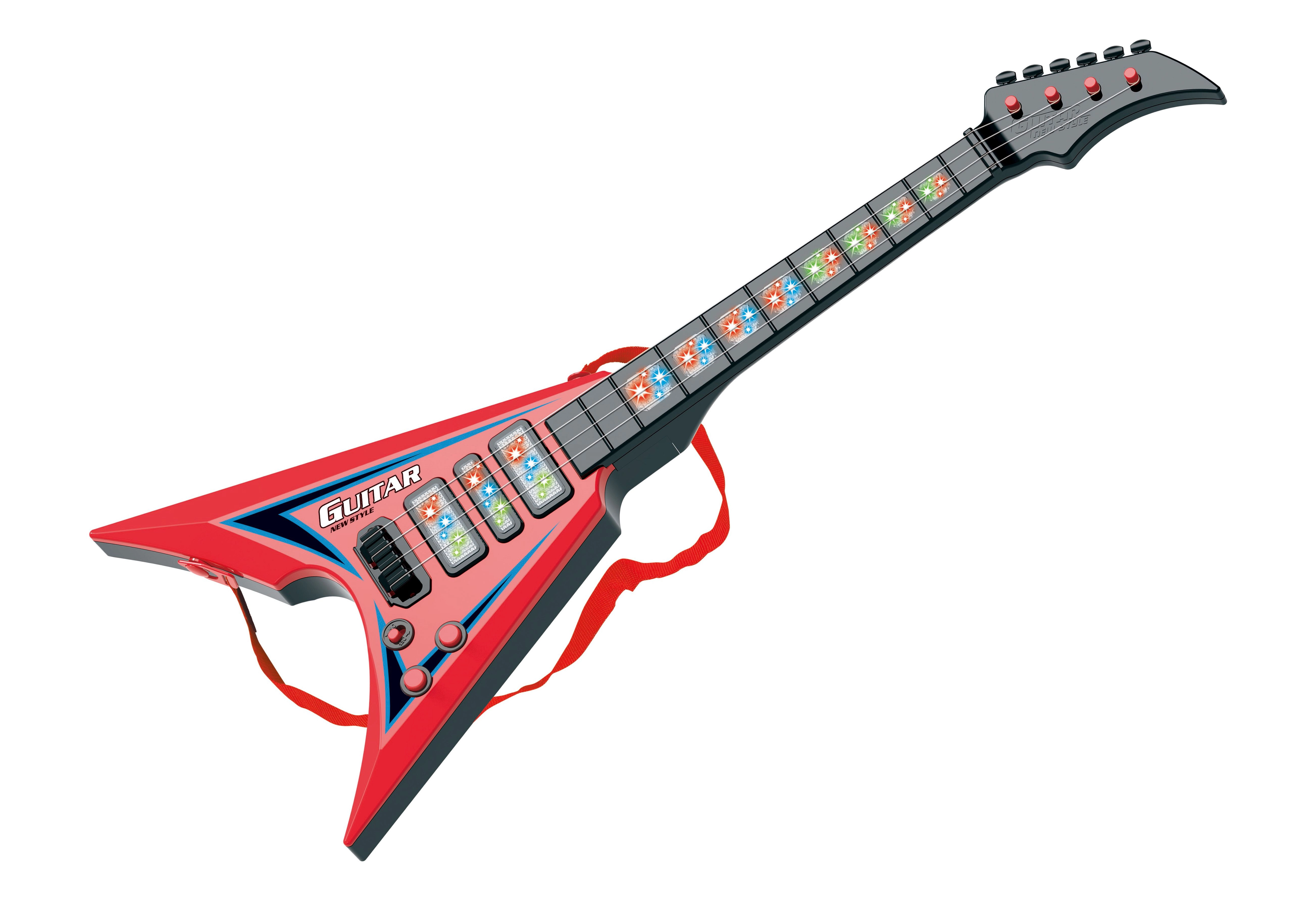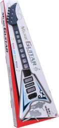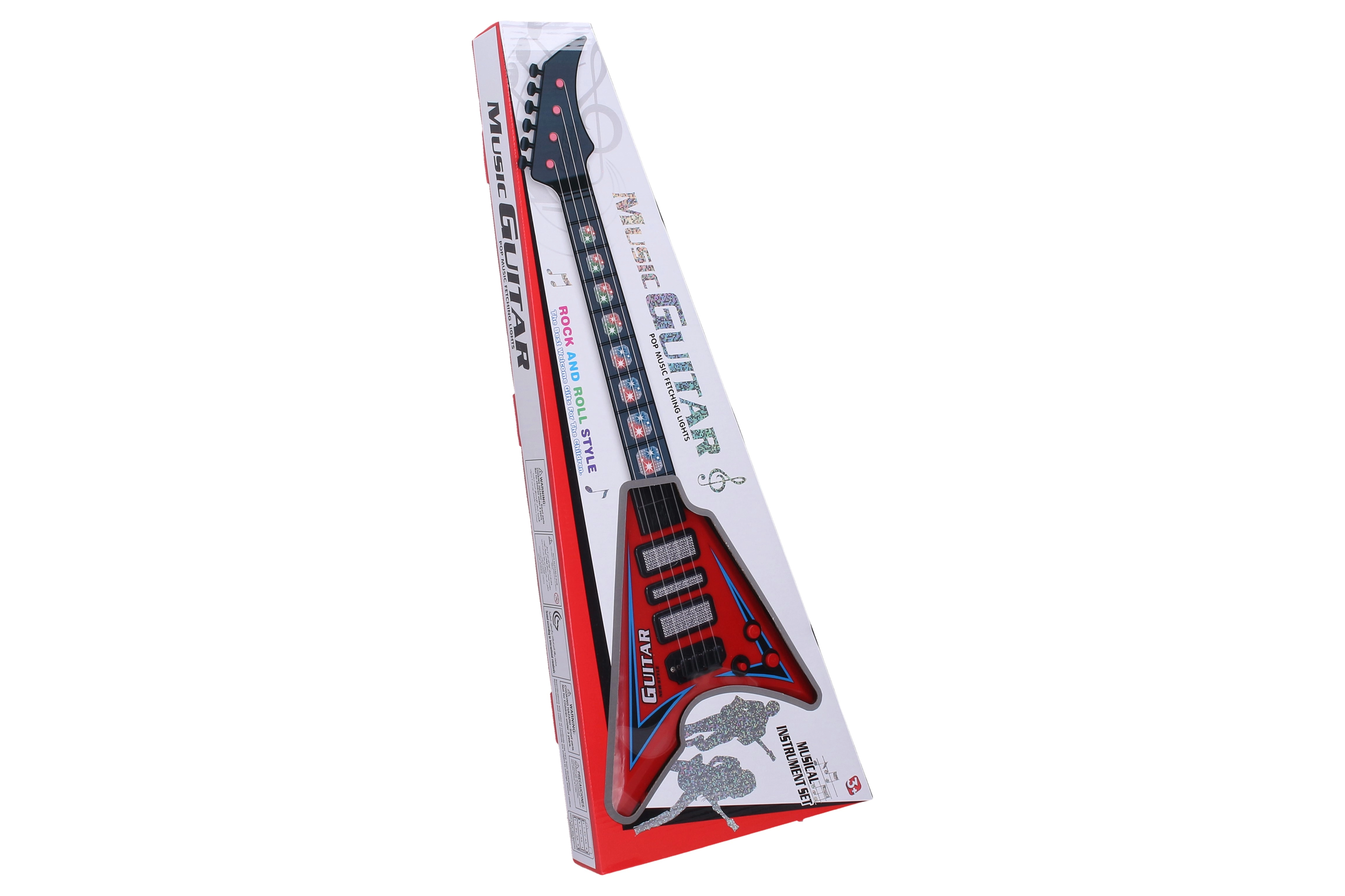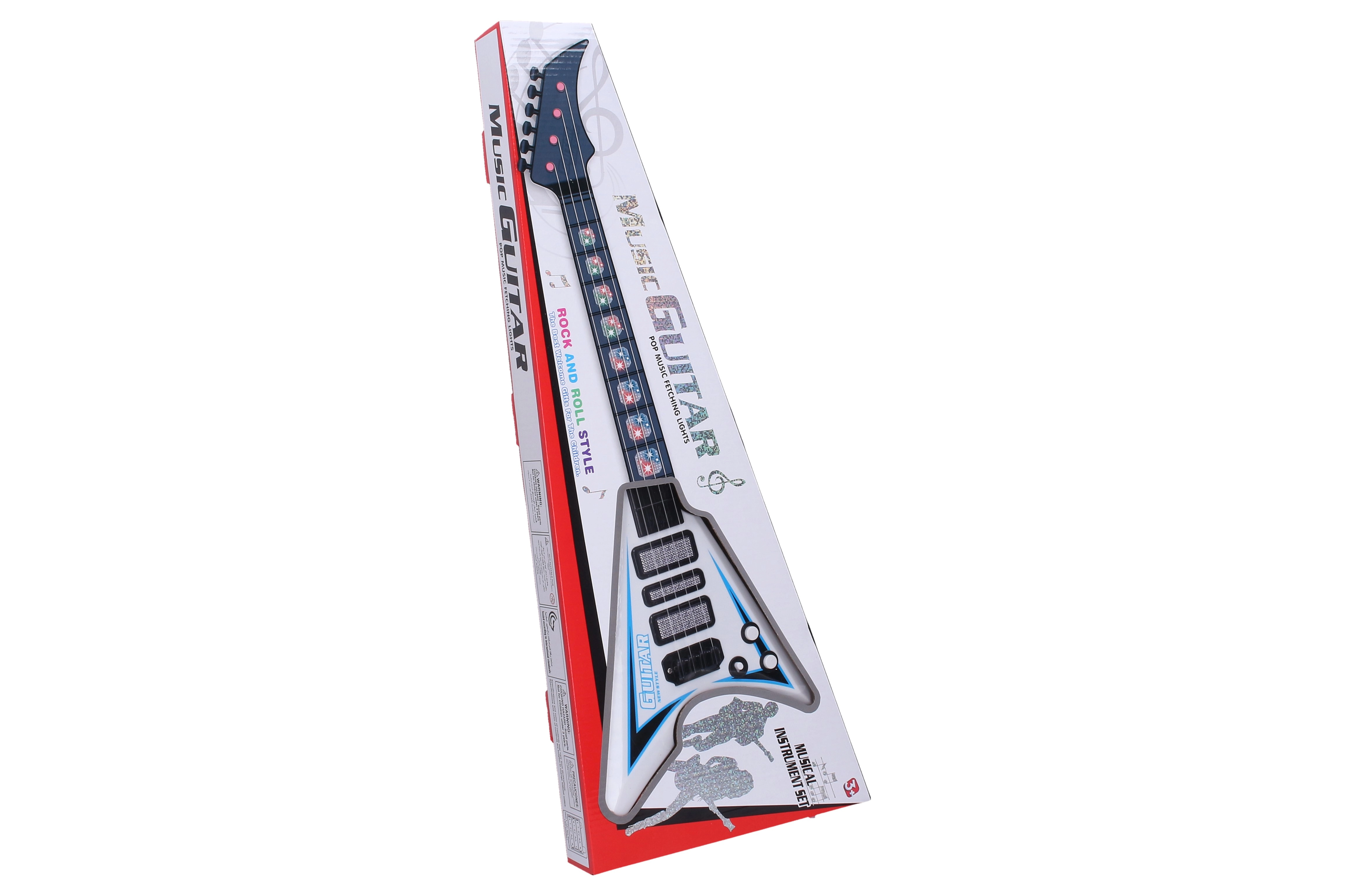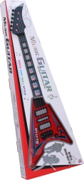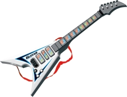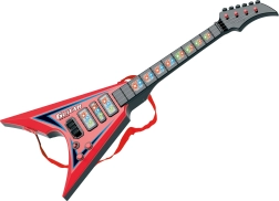 Тази електрическа китара е идеална както за начинаещи, така и за напреднали музиканти благодарение на своите размери 22x5x56 см. Има светлинни и звукови ефекти, които създават уникално изживяване при свирене. Захранване с три батерии 3xAA, които не са включени в комплекта, и лесно управление чрез ON/OFF превключвател при потенциометрите. И двата потенциометъра служат за управление на ефектите.