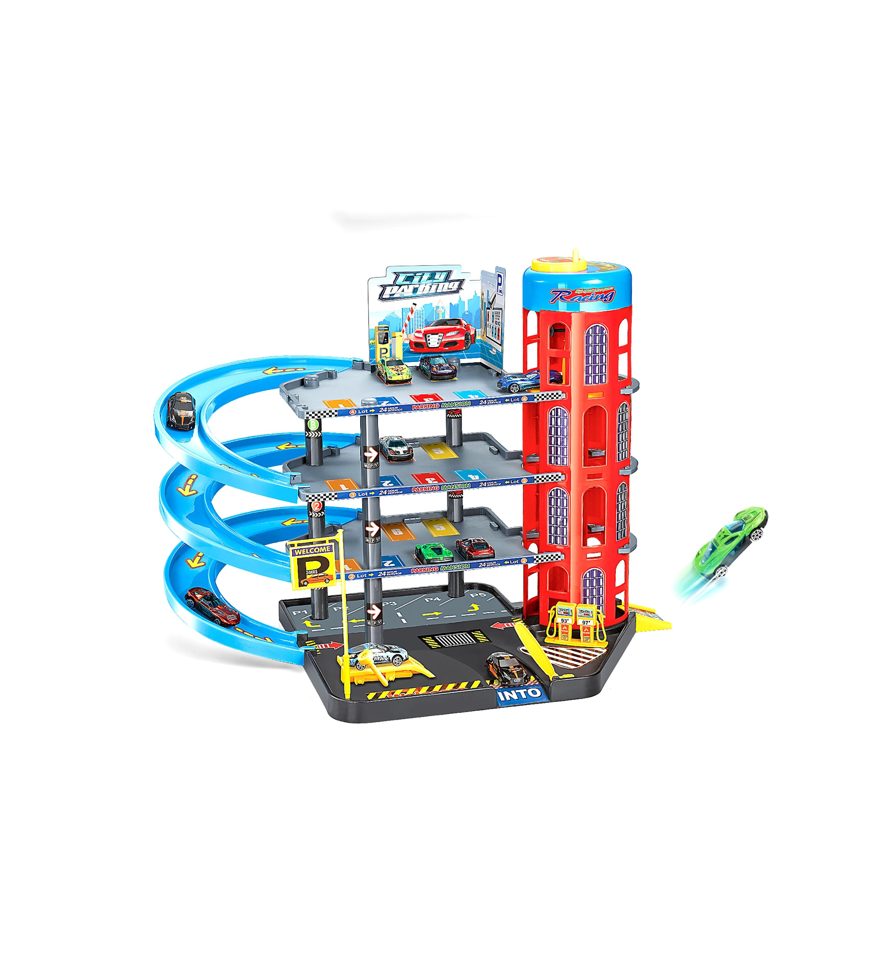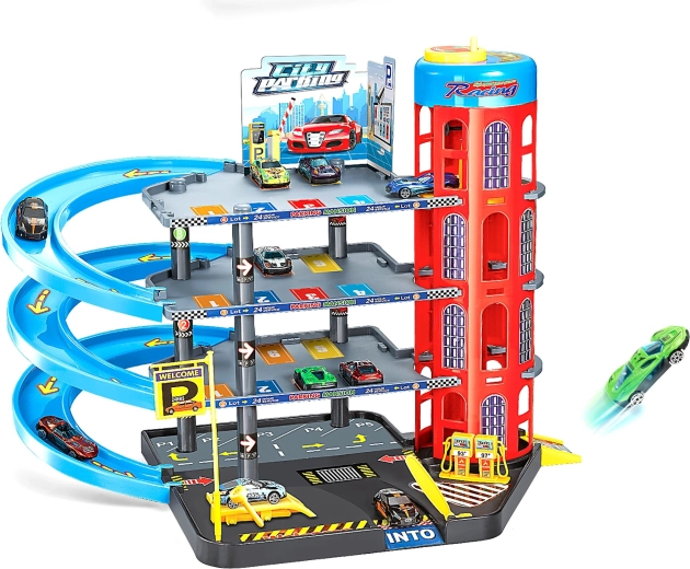 Децата ще се насладят на реалистични елементи като ръчен асансьор за преместване на колите между етажите, бензиностанция за зареждане, зарядно за електрически превозни средства и повдигаща платформа за „сервиз“. В комплектa има и бариера за регулиране на трафика, което прави целия сет пълна игрова станция.
