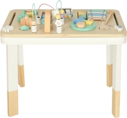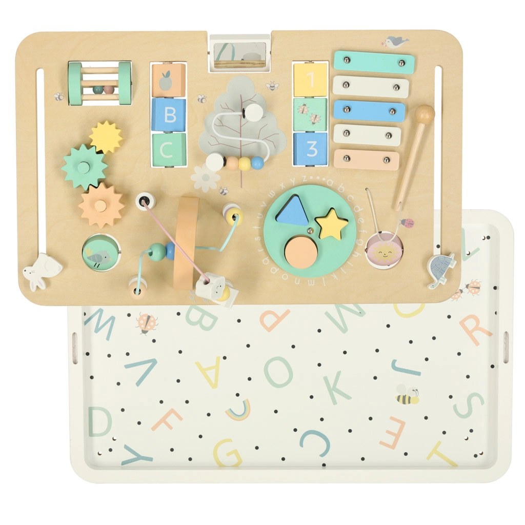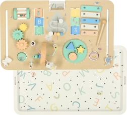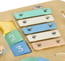 Ксилофон, сортер за форми, зъбни колела с плъзгачи и лабиринт с мъниста поддържат децата ангажирани за дълго и естествено развиват фината моторика и логиката.
