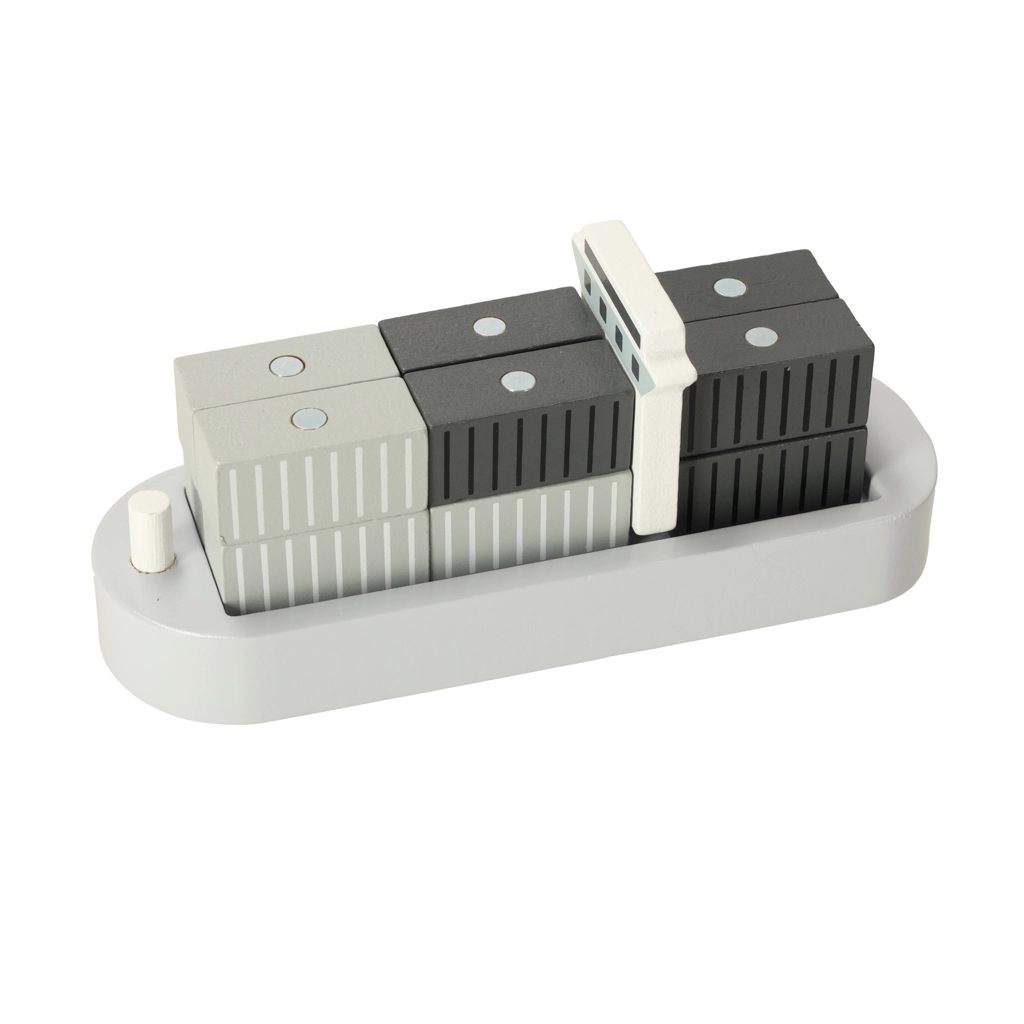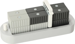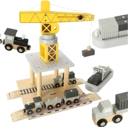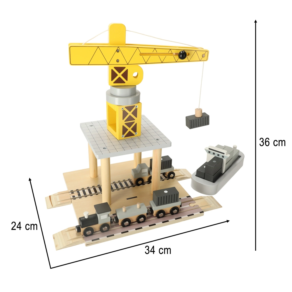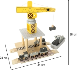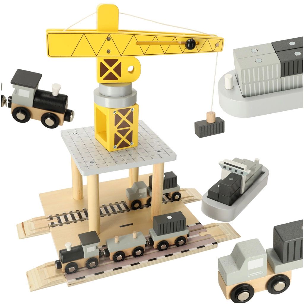 Децата ще обикнат този дървен пристанищен кран, който им предлага възможност да играят, като обслужват контейнери от кораби към коли и влакове. Този комплект предоставя много елементи за разнообразни сценарии, развива въображението и фината моторика на вашето дете.