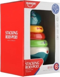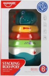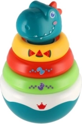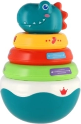 Тази игрива сглобяема пирамида с мотив динозавър съчетава забавление и учене. Закръглената основа се поклаща във всички посоки при почукване и активира приятен звук от дрънкалка, който естествено стимулира слуха. Децата упражняват захвата, сортират ринговете по размер и разпознават цветовете – идеално за първи открития на света.