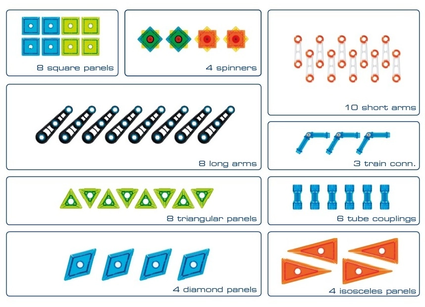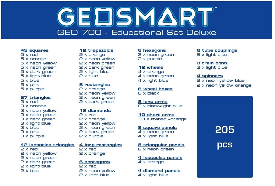 Образователният конструктор GeoSmart е идеален за насърчаване на креативността и ученето на децата. Комплектът включва: