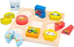 Запознайте се с различни превозни средства с тази цветна вгнездяваща дъска. Пъзелът включва кораб, самолет, линейка, училищен автобус, пожарна кола, багер, такси, трактор и полицейска кола. Това е перфектна игра, която не само стимулира разпознаването на форми и цветове, но и тренира паметта и развива фината моторика на децата.