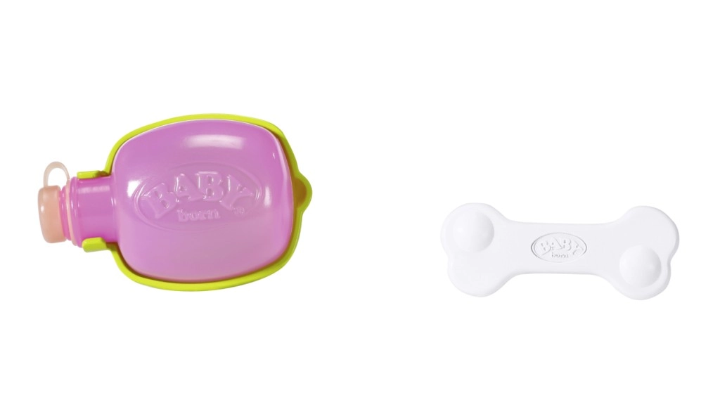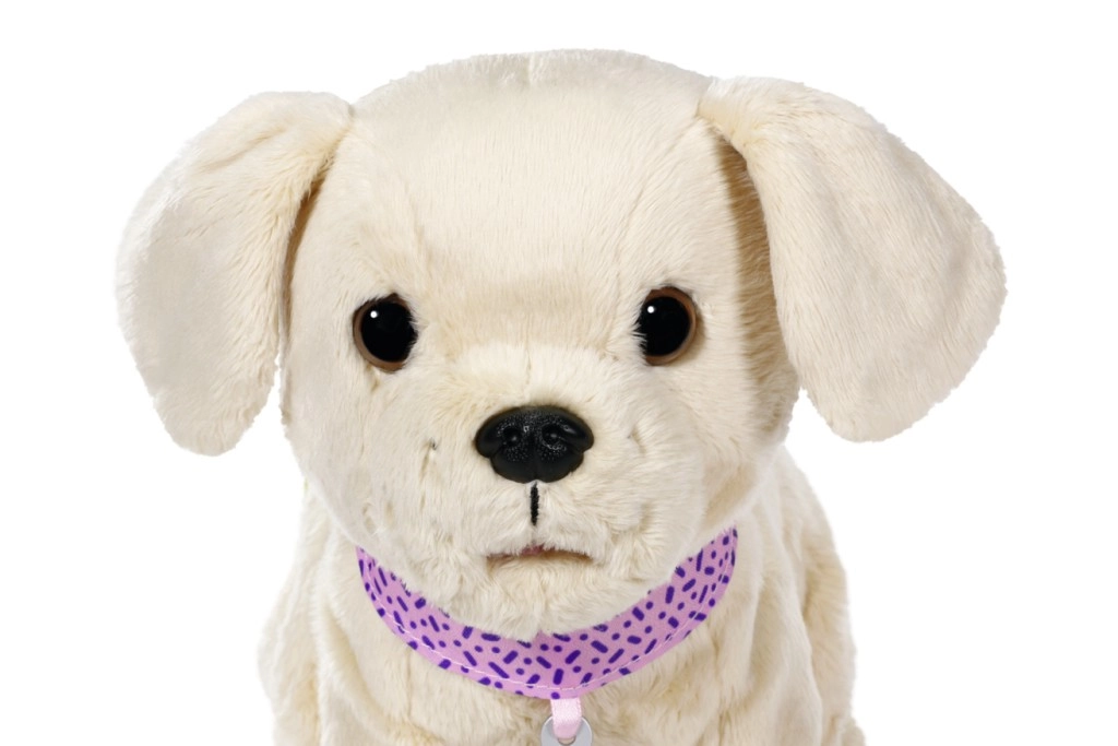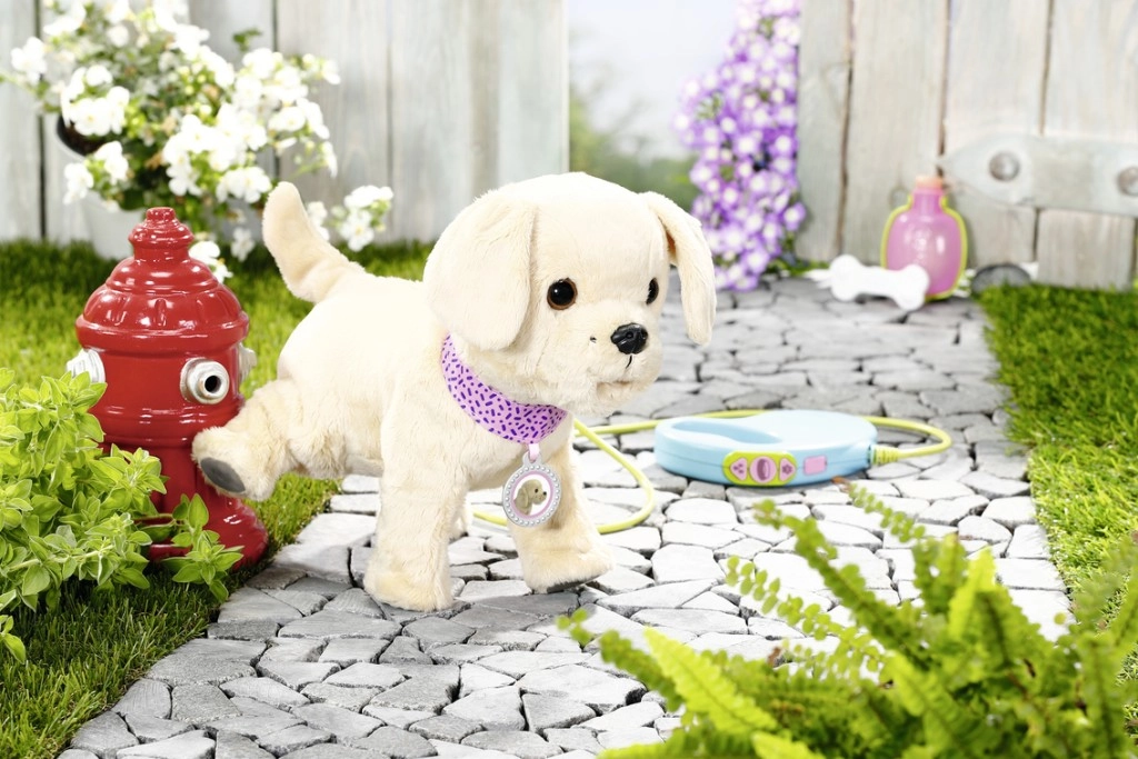 Когато пие от купичката, кученцето навежда главичка, подава езиче и се чува как сърба. След пиене вдига лапичка и се изпишква – реалистична функция, която ще въодушеви децата и ще развихри фантазията им в играта на грижа за животинче. Костичката задейства хрупкащи звуци, а галенето по гърба – махане с опашка и весело лаене.