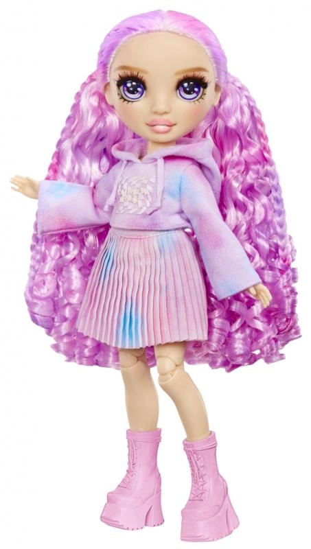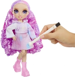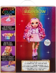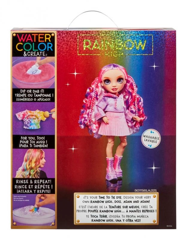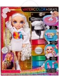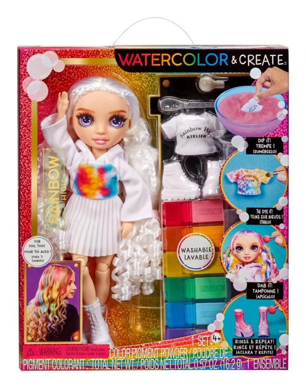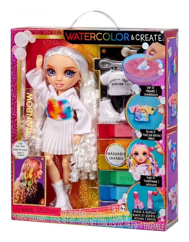 Куклата Rainbow High с водни бои ви позволява да променяте външния ѝ вид според вашето въображение. Комплектът включва кукла в бял тоалет и шест миещи се пигмента в цветовете на дъгата: червено, оранжево, жълто, зелено, синьо и лилаво. Тези пигменти можете лесно да нанесете и да променяте цветовете на дрехите и косата на куклата.