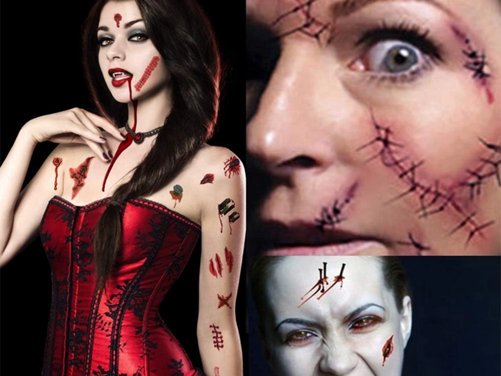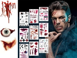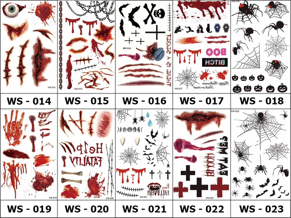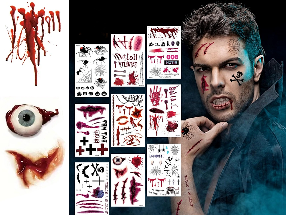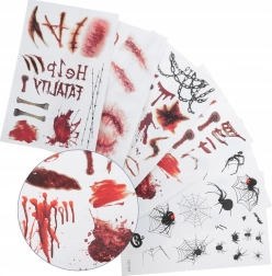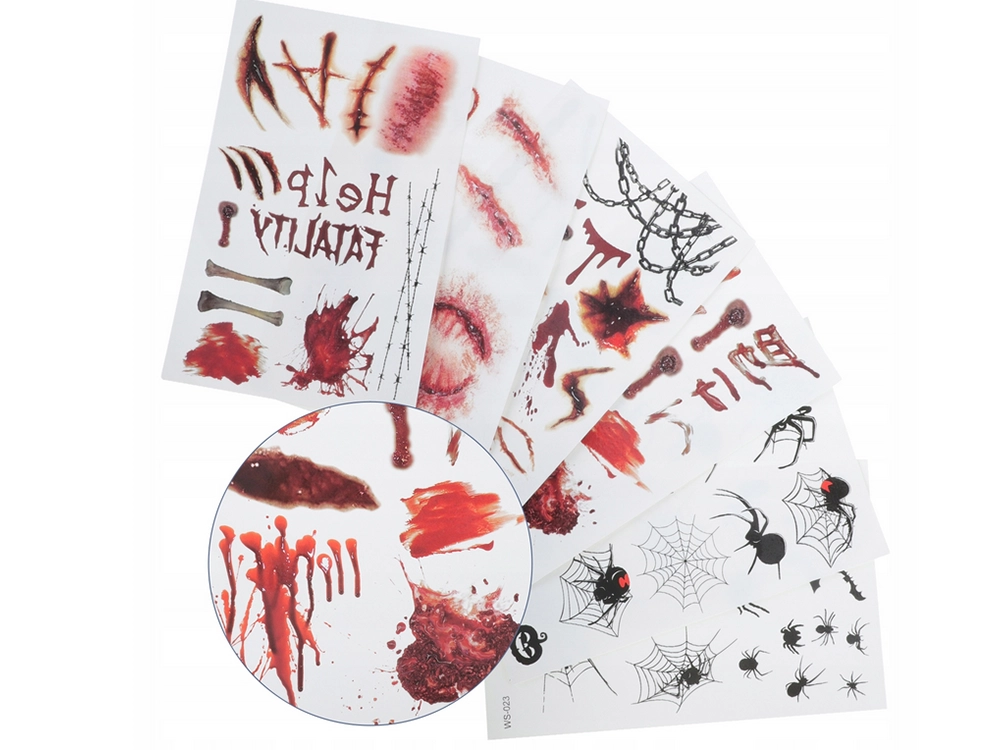 Благодарение на богатата гама мотиви лесно ще завършите грима за Хелоуин, тематични партита и фотосесии. Всеки лист предлага микс от страховити дизайни – от кървави пръски и паяжини до дълбоки белези – за максимално реалистичен ефект.