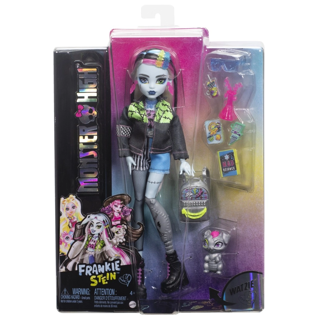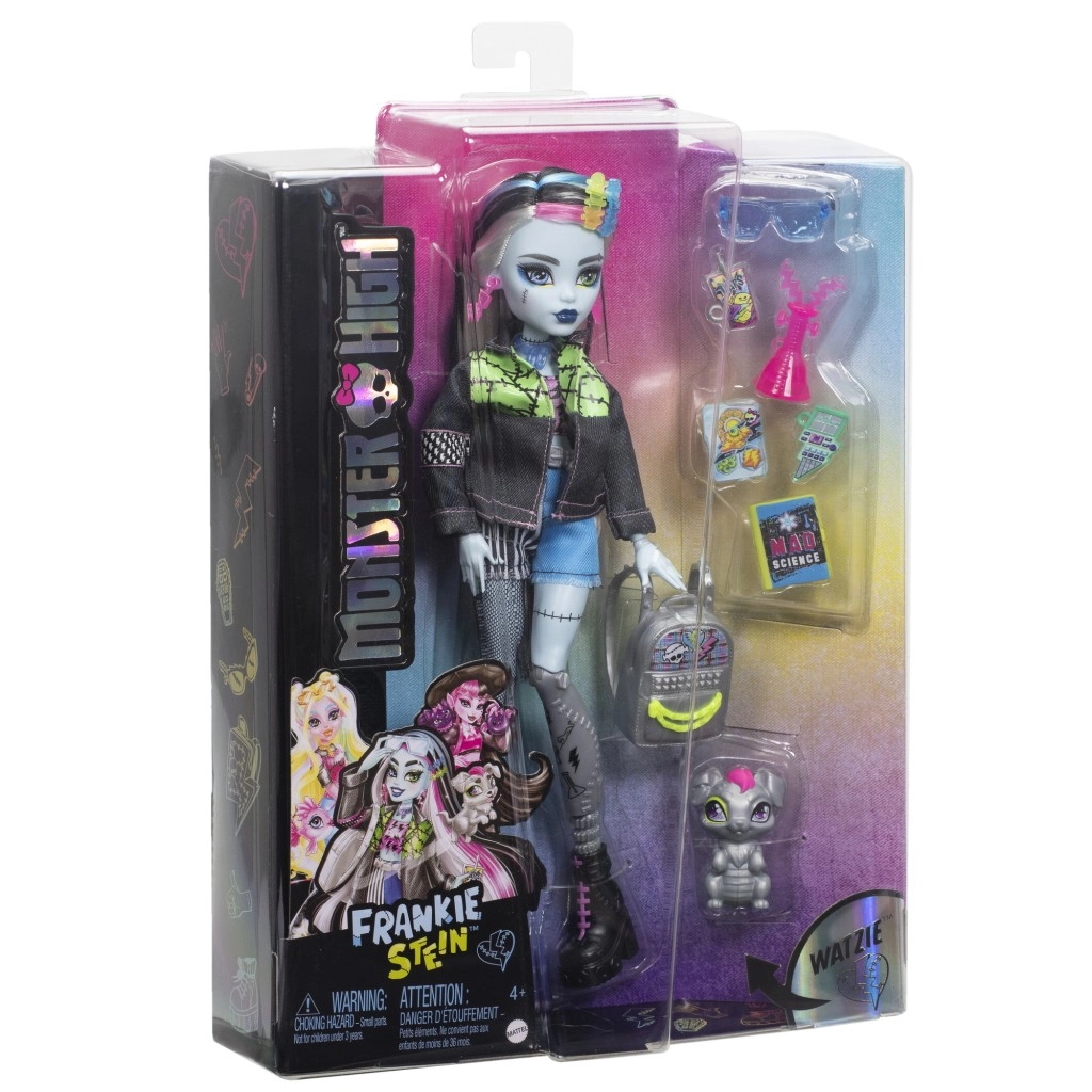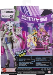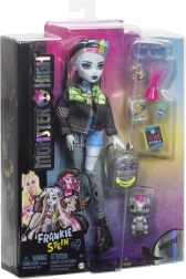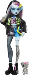 Запознайте се с емблематичната ученичка от MONSTER HIGH – Frankie Stein. Тази кукла изпъква с впечатляващ микс от пънк и техно стил: дънково яке, къси панталони, ефектни обеци във форма на мълнии и черни боти с розово връзване. Благодарение на ставите за позиранe лесно създавате готини сцени и истории.