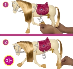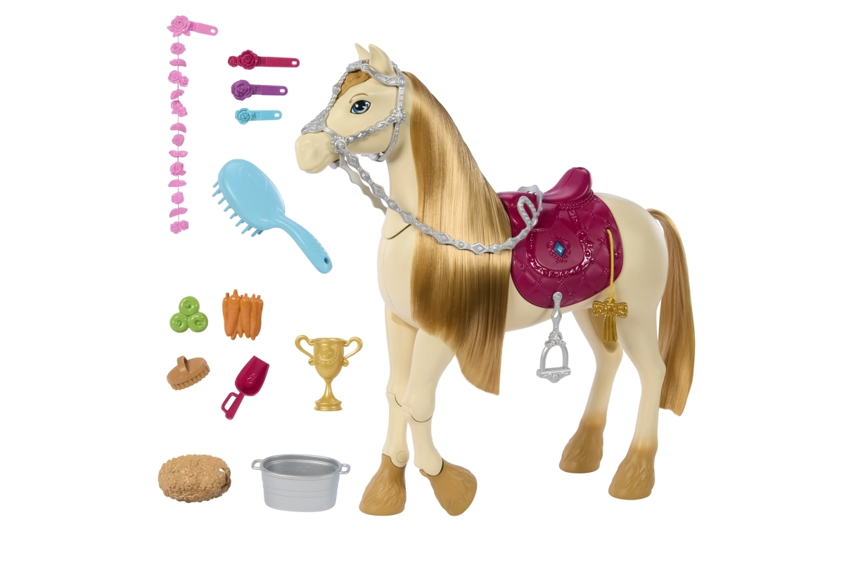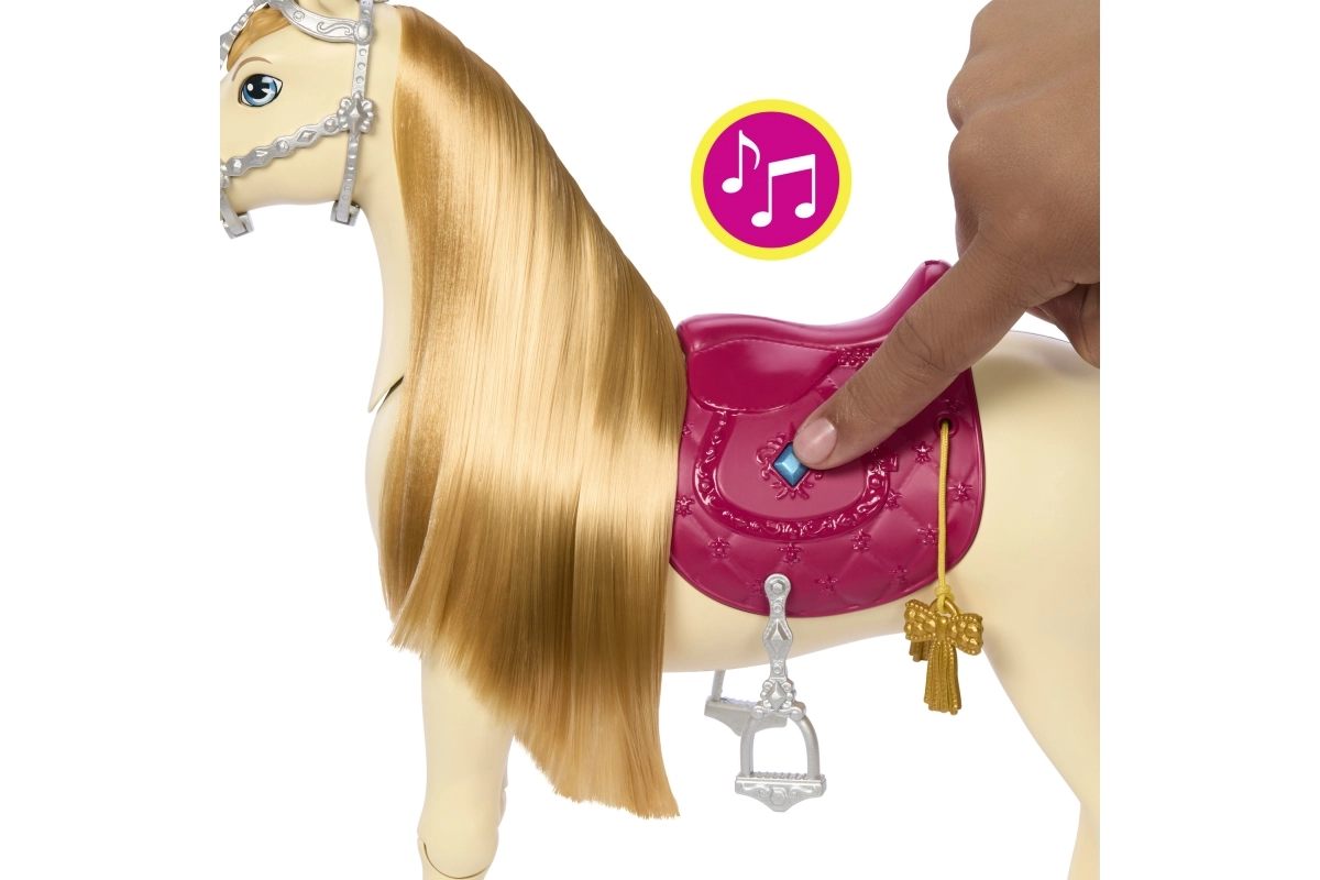 Присъединете се към Барби в незабравими приключения с нейния танцуващ кон, който предлага часове забавление и творчество. Конят умее повече от това да танцува – може също да пуска мелодии и да реагира на докосване. С 12 различни аксесоара децата могат да измислят безкрайни истории, пълни с фантазия.
