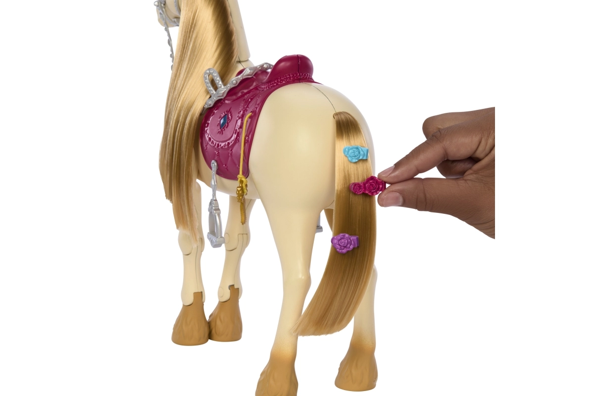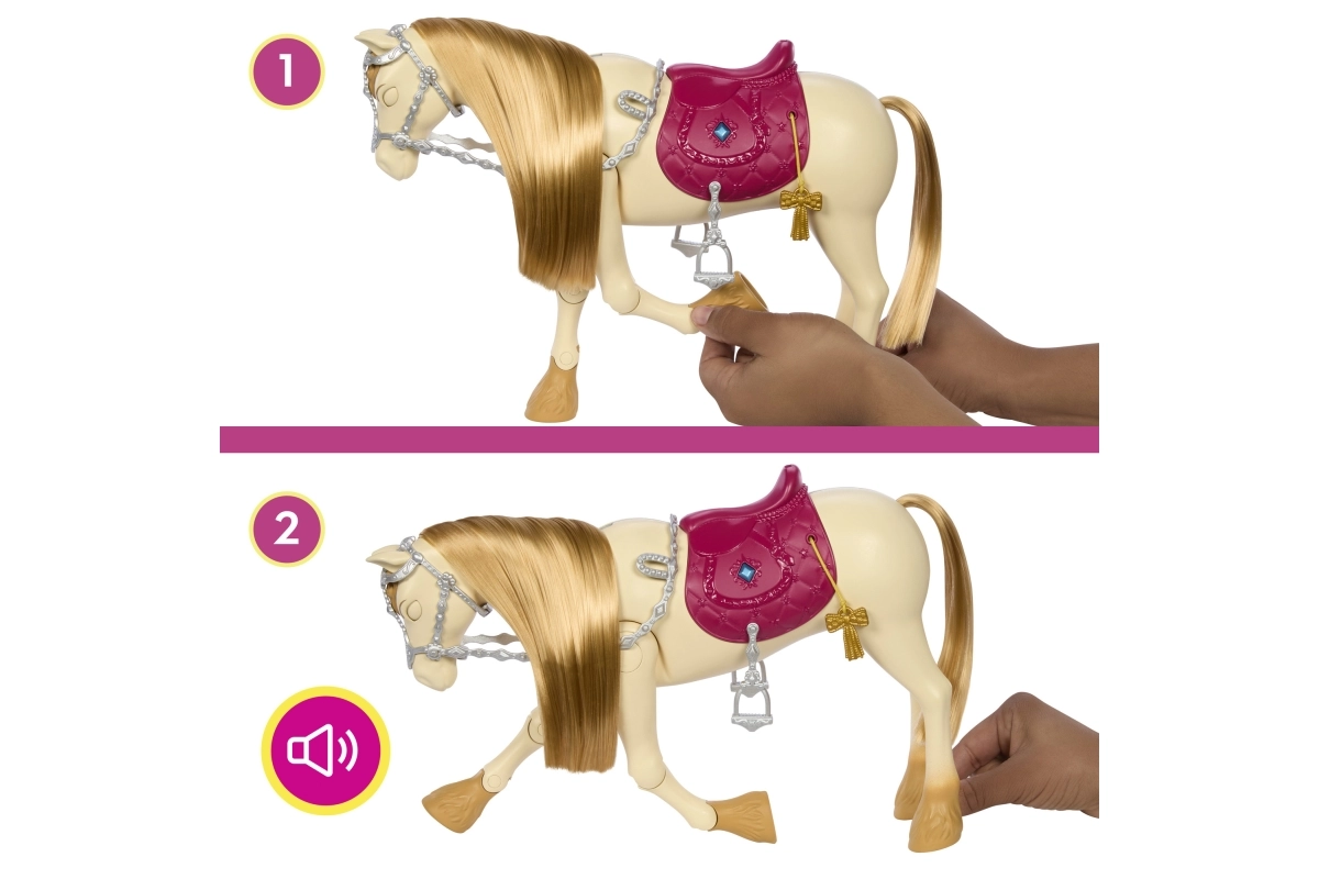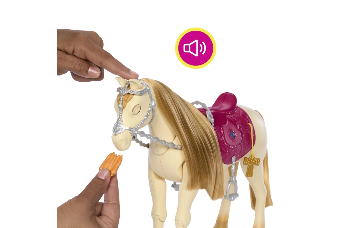 Този кон може да превърне малките начинаещи в грижовни героини. Докоснете гривата му или натиснете скъпоценния камък на седлото, за да активирате песнички и звуци. Благодарение на лакомствата, декоративните аксесоари и останалите компоненти за разказване на истории, този кон е готов да добави магия към всеки детски ден.