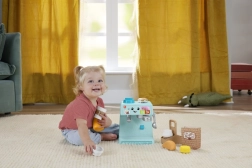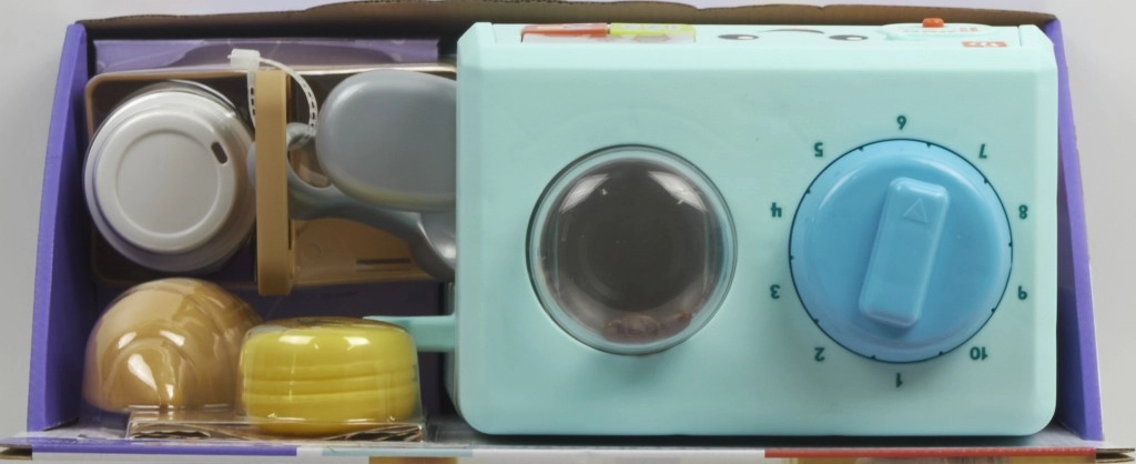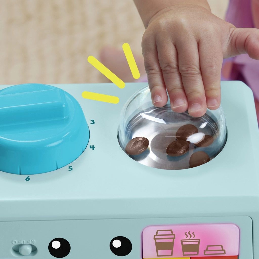 Децата могат да натискат бутони, за да симулират приготвяне на кафе, да въртят колелце за пяна или да движат мелничката за кафе, за да видят как „изскачат“ кафените зърна. В комплекта има и игрални аксесоари: две чашки за кафе, лъжичка, кроасан, мека торбичка за стоки с капаче, чашка за мляко и подложка за носене.