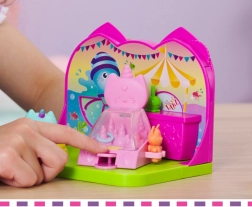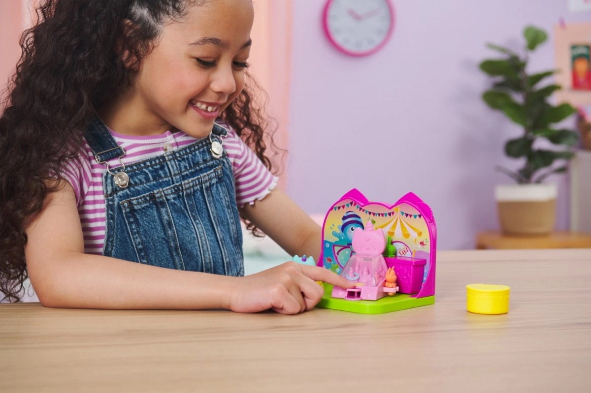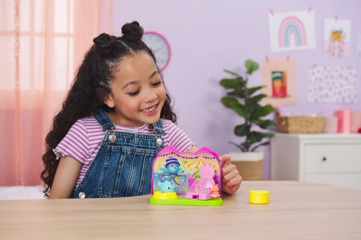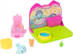 Изживейте карнавално забавление в стаята за кукленската къща GABBY'S DOLLHOUSE! Очаква ви сладката фигурка Нарвалкотки (около 5 см), басейн с топки, игра с рингове, щанд с напитки и лакомства, въртяща се сцена и изненада от Котешка пратка. Идеално за развитие на въображението и ролеви игри за деца от 3 години.