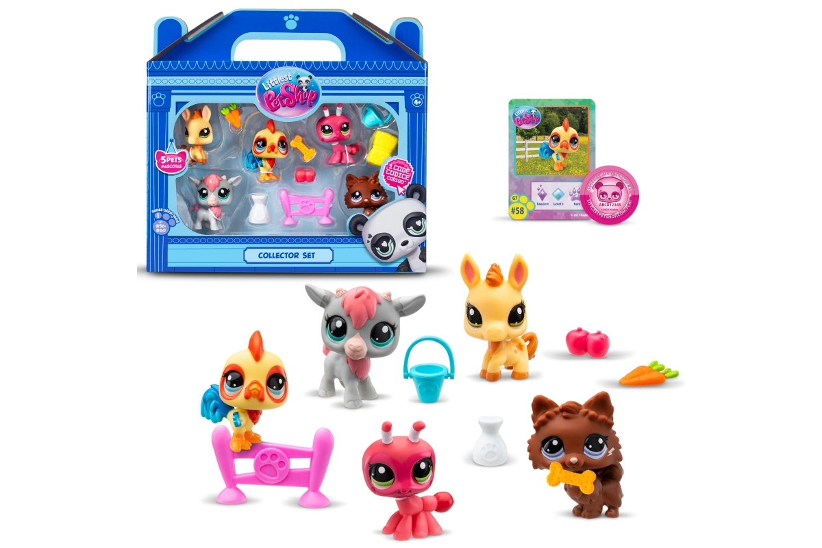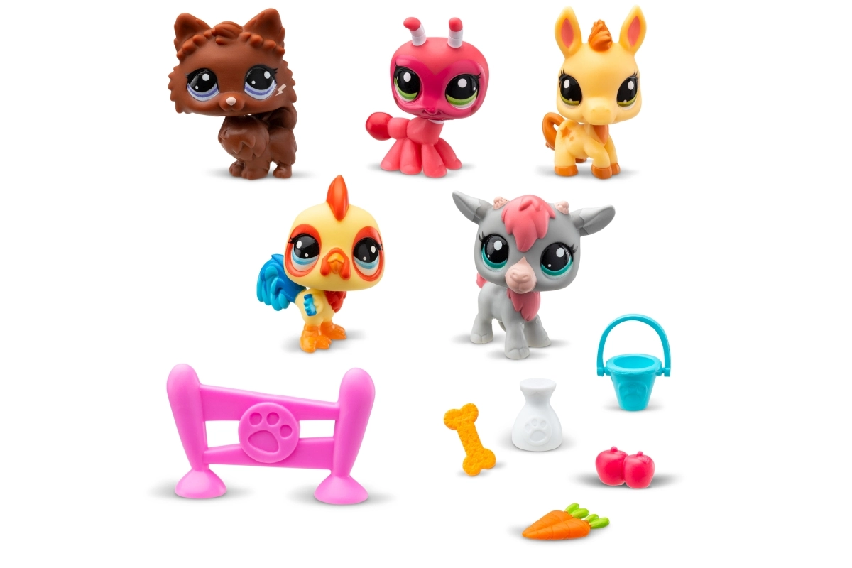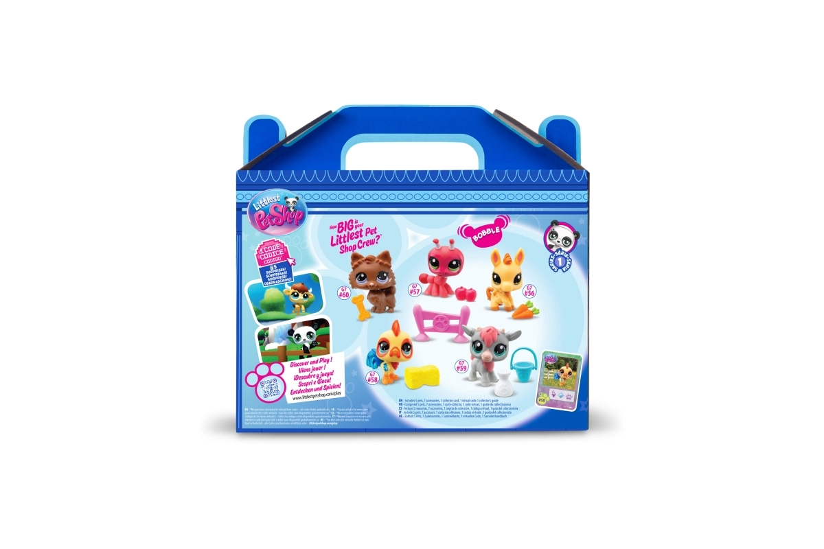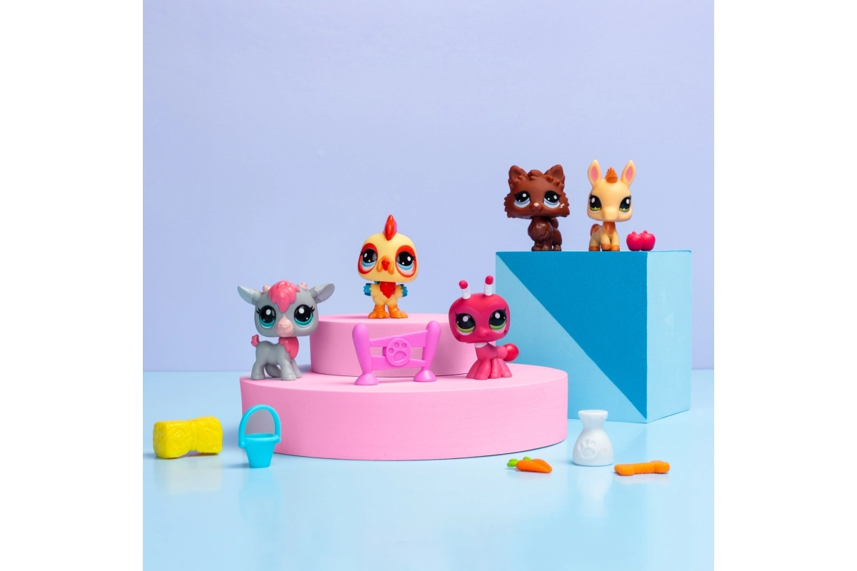 Създайте своята мечтана ферма с новото поколение Littlest Pet Shop. В комплекта ще откриете пет пъстри любимци (напр. пиленце, агънце, кученце, насекомче или конче) и набор от тематични аксесоари, с които децата лесно измислят собствени истории. Фигурките имат характерни големи очи, ярки цветове и са чудесни за имагинативна игра и колекциониране.
