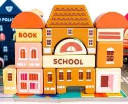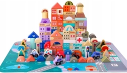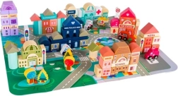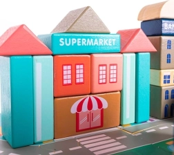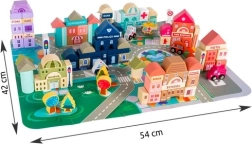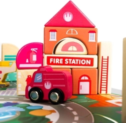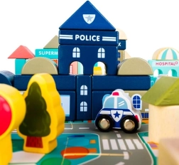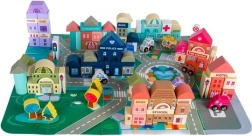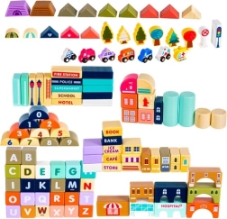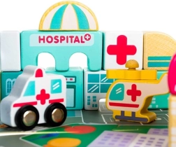 Богатото оборудване включва сгради като училище, болница, пожарна станция, полиция, банка, книжарница, супермаркет, музей и кафене, както и 7 превозни средства (полиция, пожарна, линейка, такси, училищен автобус, кола, хеликоптер). Дървените елементи са внимателно шлифовани, ръбовете заоблени, а боите – нетоксични, което е идеално за безопасна детска игра.