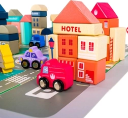 Изградете пълна градска сцена върху прегледна пъзел подложка 54 × 42 см. Децата могат да планират улици, да разполагат сгради и да откриват как функционира градът. Комплектът развива координация око–ръка, логическо мислене и насърчава съвместна игра между братя и сестри или приятели.