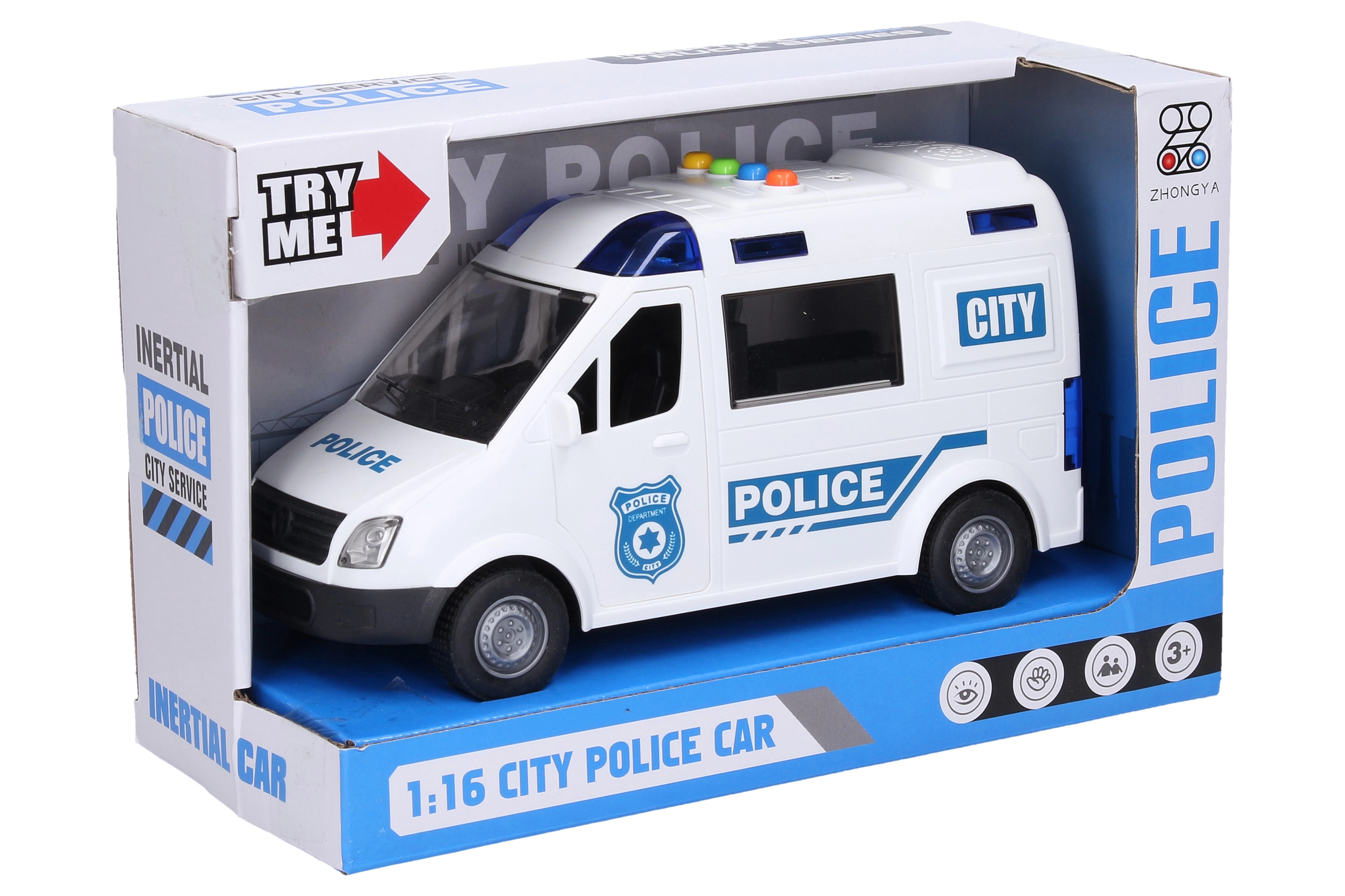 Тази полицейска кола е оборудвана със светлинни и звукови ефекти, които се активират с бутони върху кабината. Децата ще се насладят на реалистична игра благодарение на отварящите се предни и задни врати. Колата се задвижва от инерционен механизъм, което осигурява плавно движение.