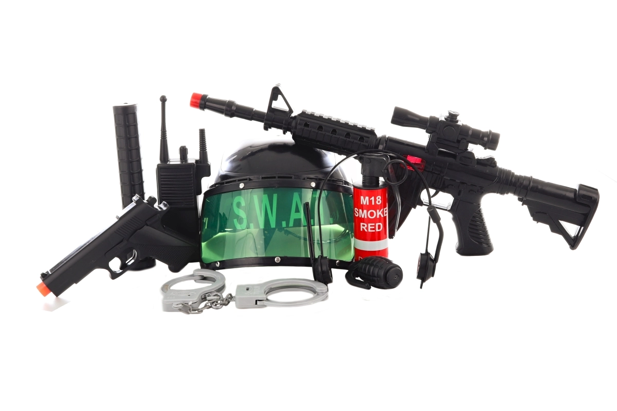- Каска, жилетка, автомат, пистолет, уоки-токи, палка, белезници, слушалки, граната