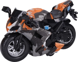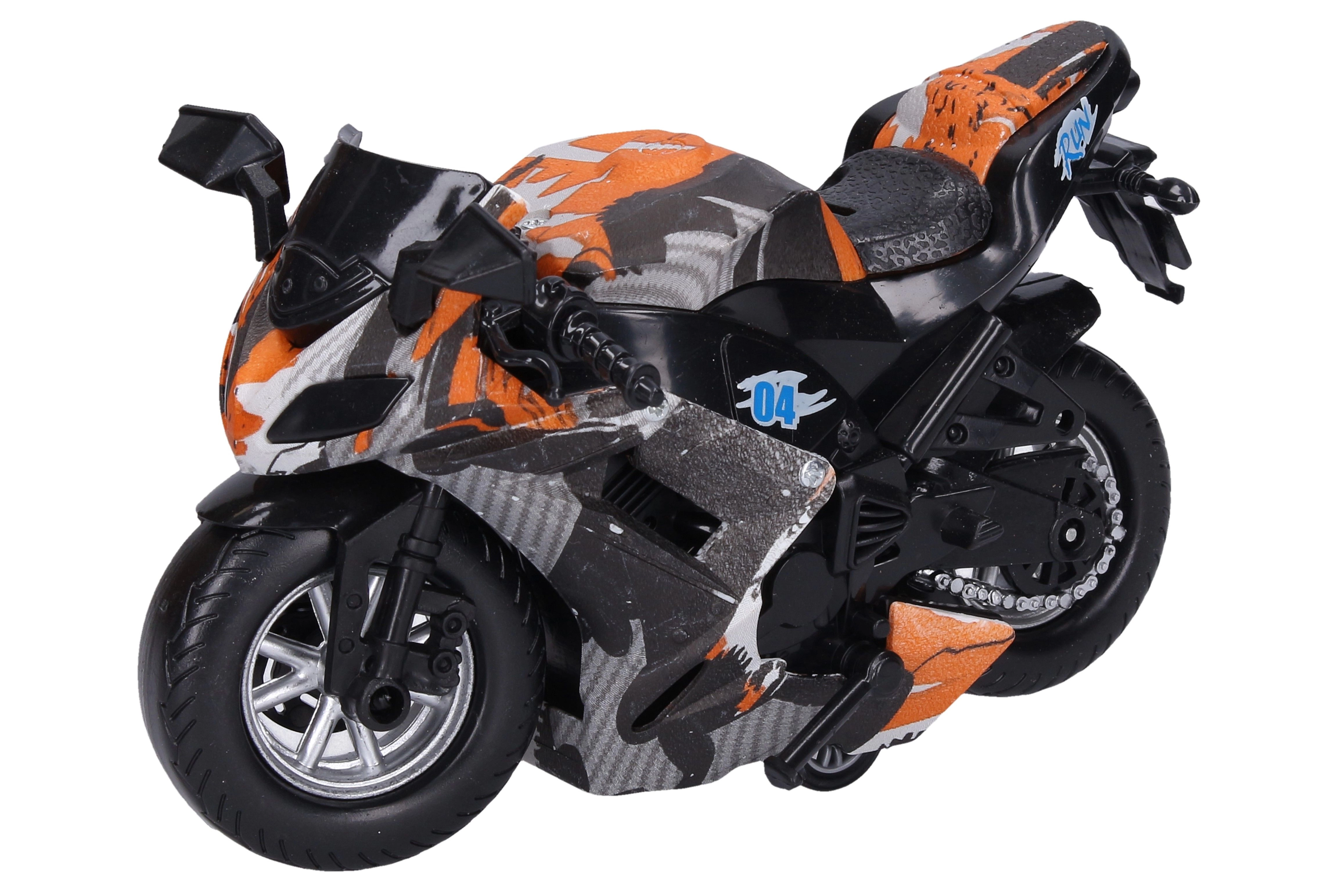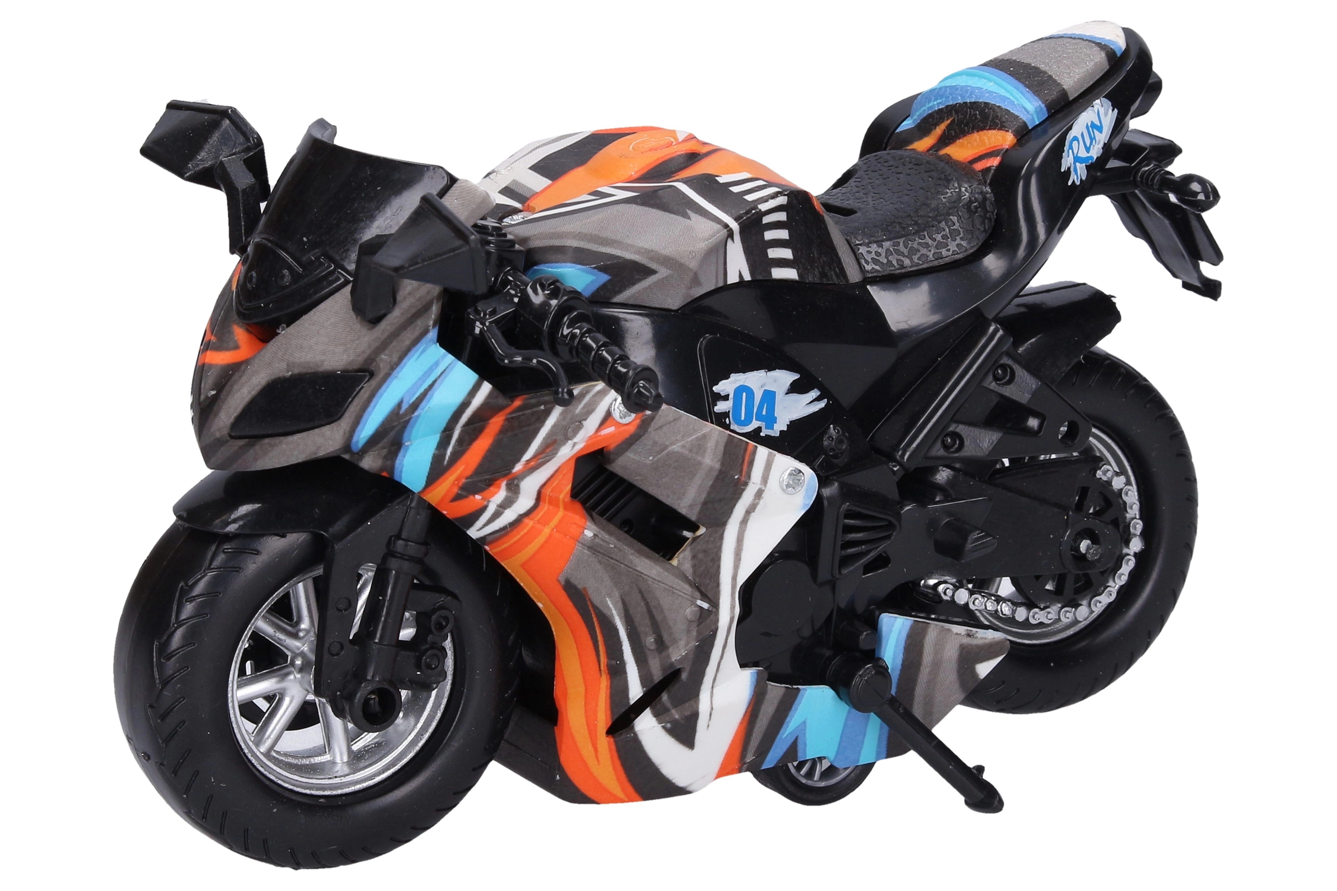 Този стилен мотор с връщащ механизъм носи бързо забавление без нужда от батерии. Просто дръпване назад и плавен старт напред го правят перфектна играчка за деца, които обичат състезанията и динамичната игра. Компактният размер 16 см се побира в раничка или джоба на количката.