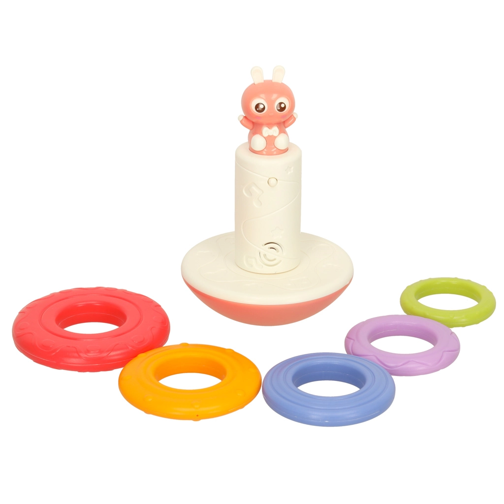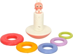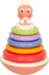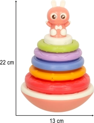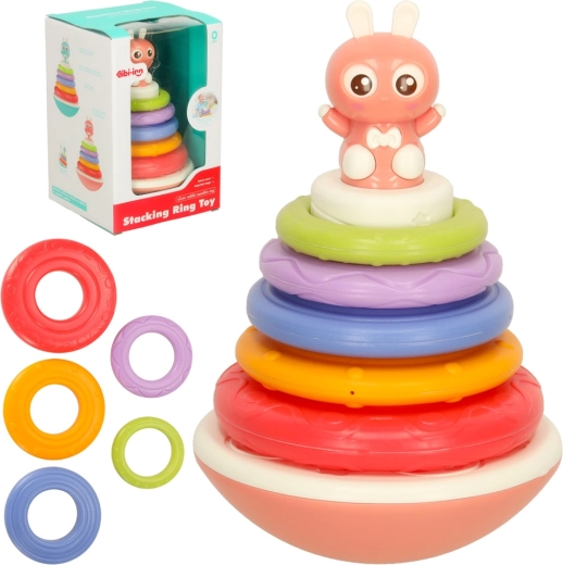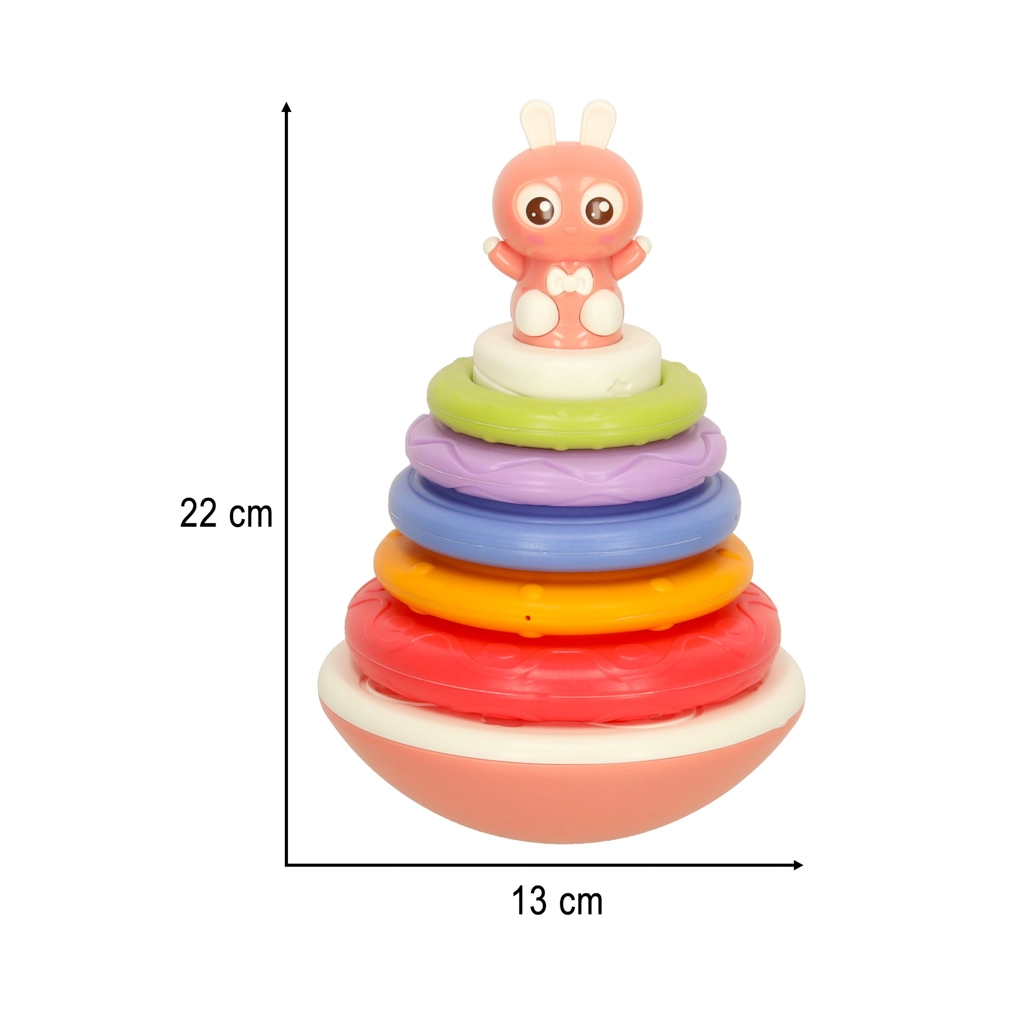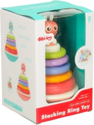 Люлеещата се играчка Bibi-Inn е проектирана да стимулира зрението, слуха и моториката на вашето дете. Забавното зайче на върха на основата и пъстрата палитра от рингове гарантират часове забавление при създаване на дъгова кула.