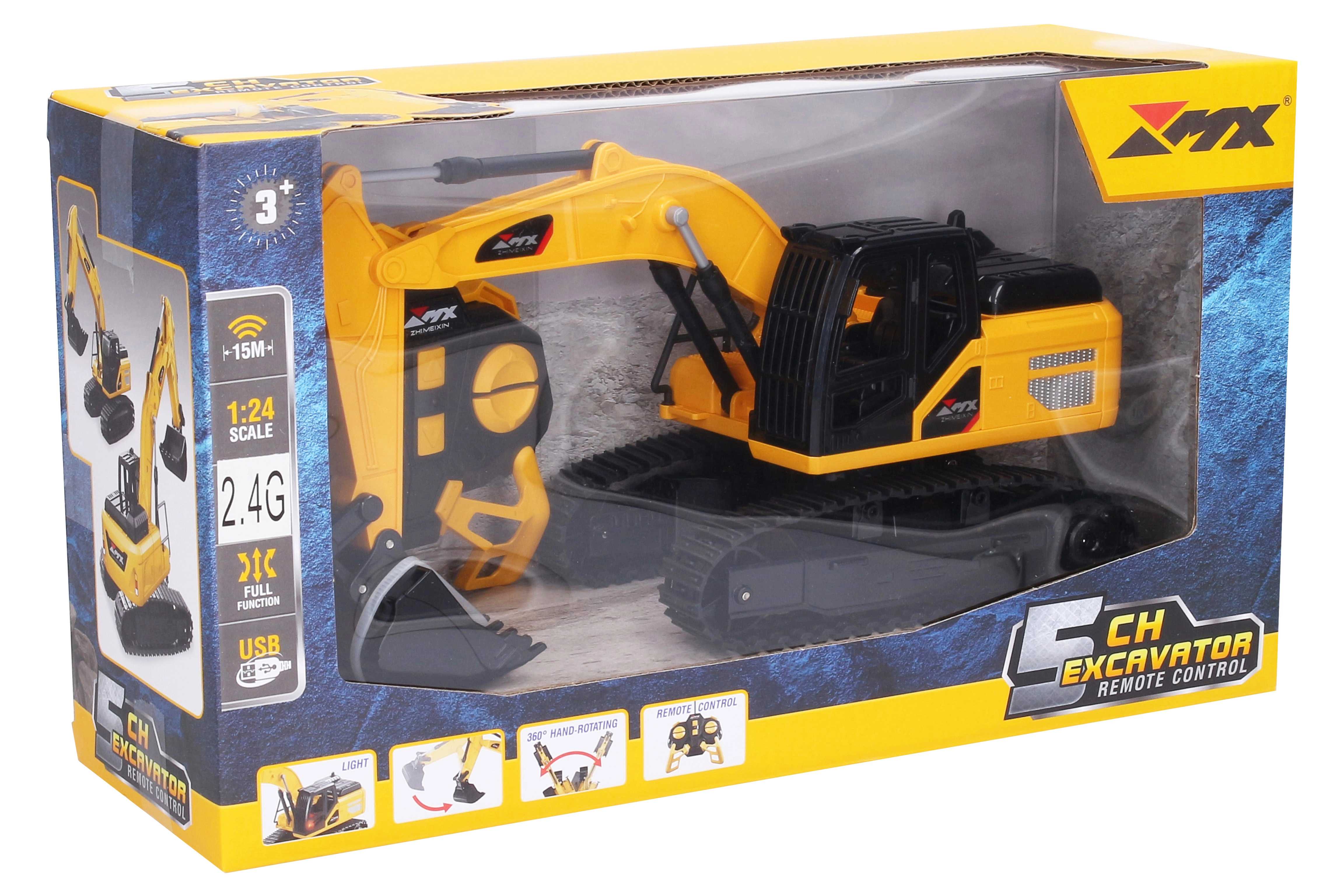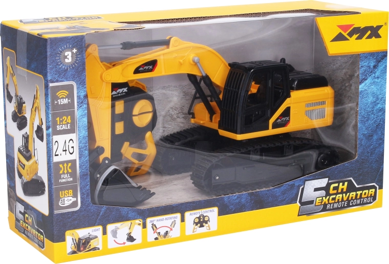 Моделът е готов за работа – в опаковката ще намерите акумулаторен батериен пакет 3,7 V 500 mAh и USB кабел за зареждане. Контролерът изисква 2× AA батерии (не са включени). Превключвателят ON/OFF е разположен в долната част на багера за лесно включване. Ръчното завъртане на основата подкрепя реалистичната игра и развитието на фината моторика.