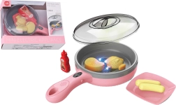Практичният комплект съдържа всичко необходимо за сервиране – тиган с капак, чинийка, кетчуп и 4 броя храна. Идеално допълнение към детската кухничка, което подпомага ролева игра, фината моторика и креативността.
