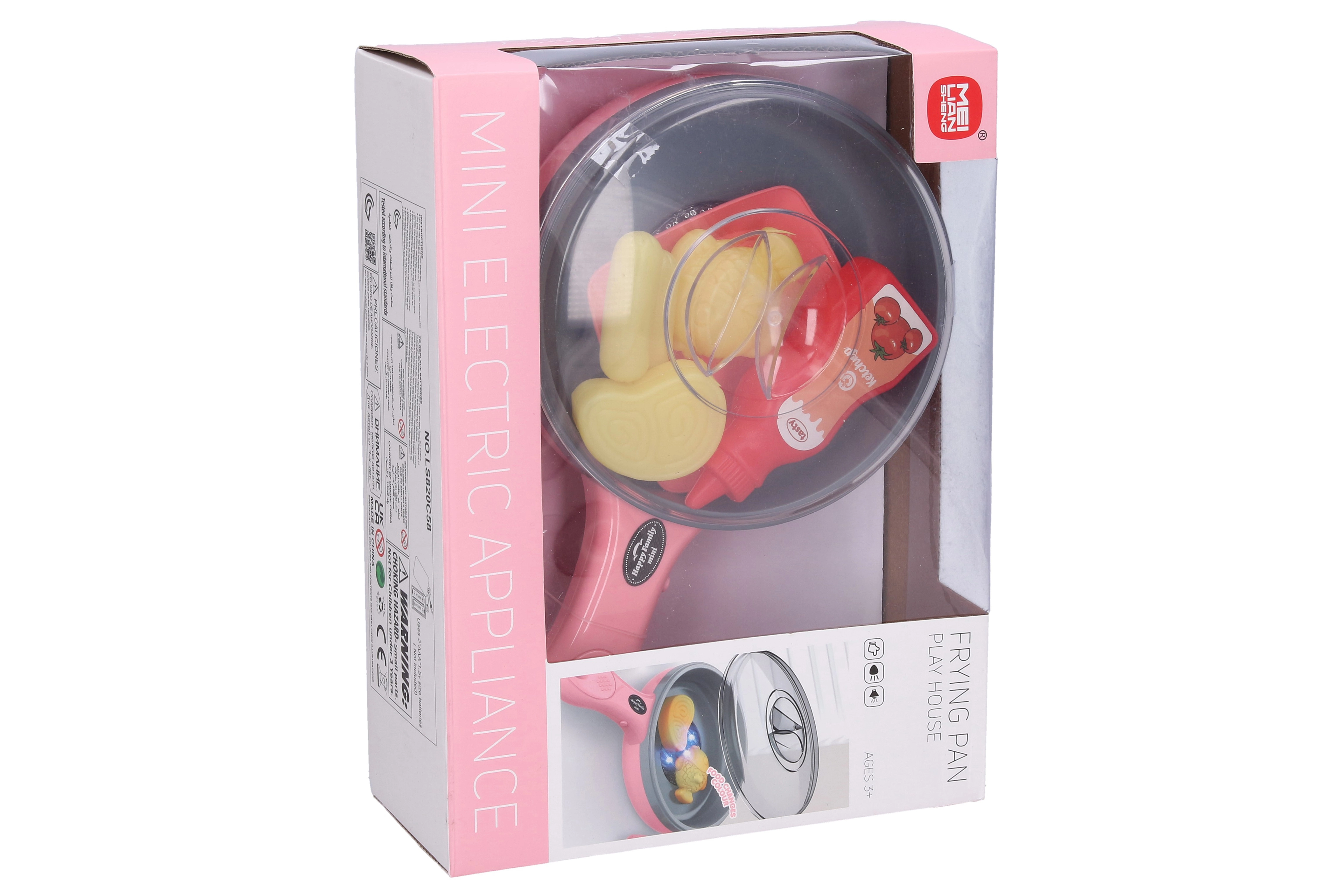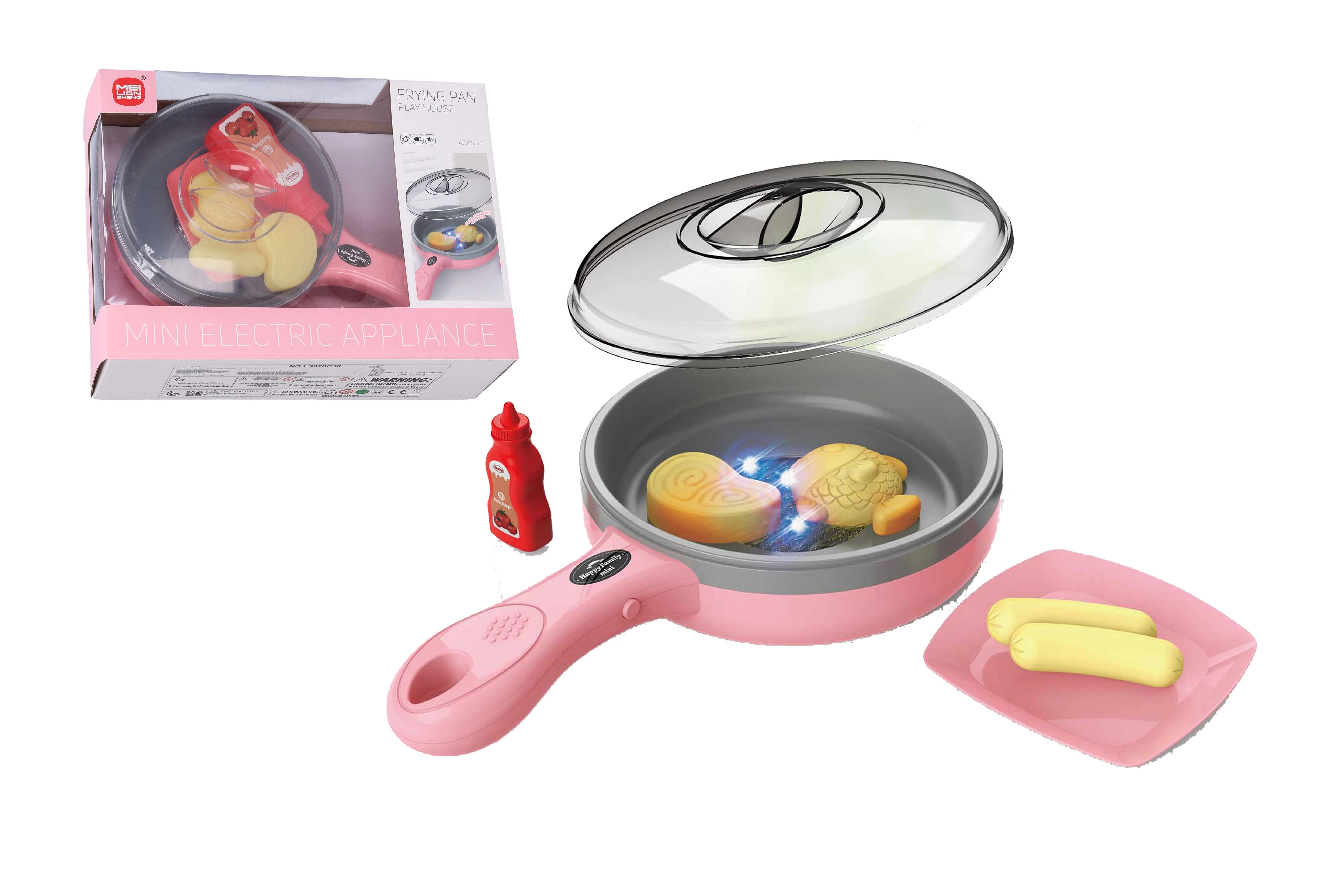 Забавна играчка за детската кухничка – електронен розов тиган с диаметър около 27 см, който по време на „пържене“ сменя цвета на храната и предлага светлинни и звукови ефекти. В комплекта са включени тиган с капак, чинийка, кетчуп и 4 броя храна. Работи с 2× AAA батерии (не са включени).