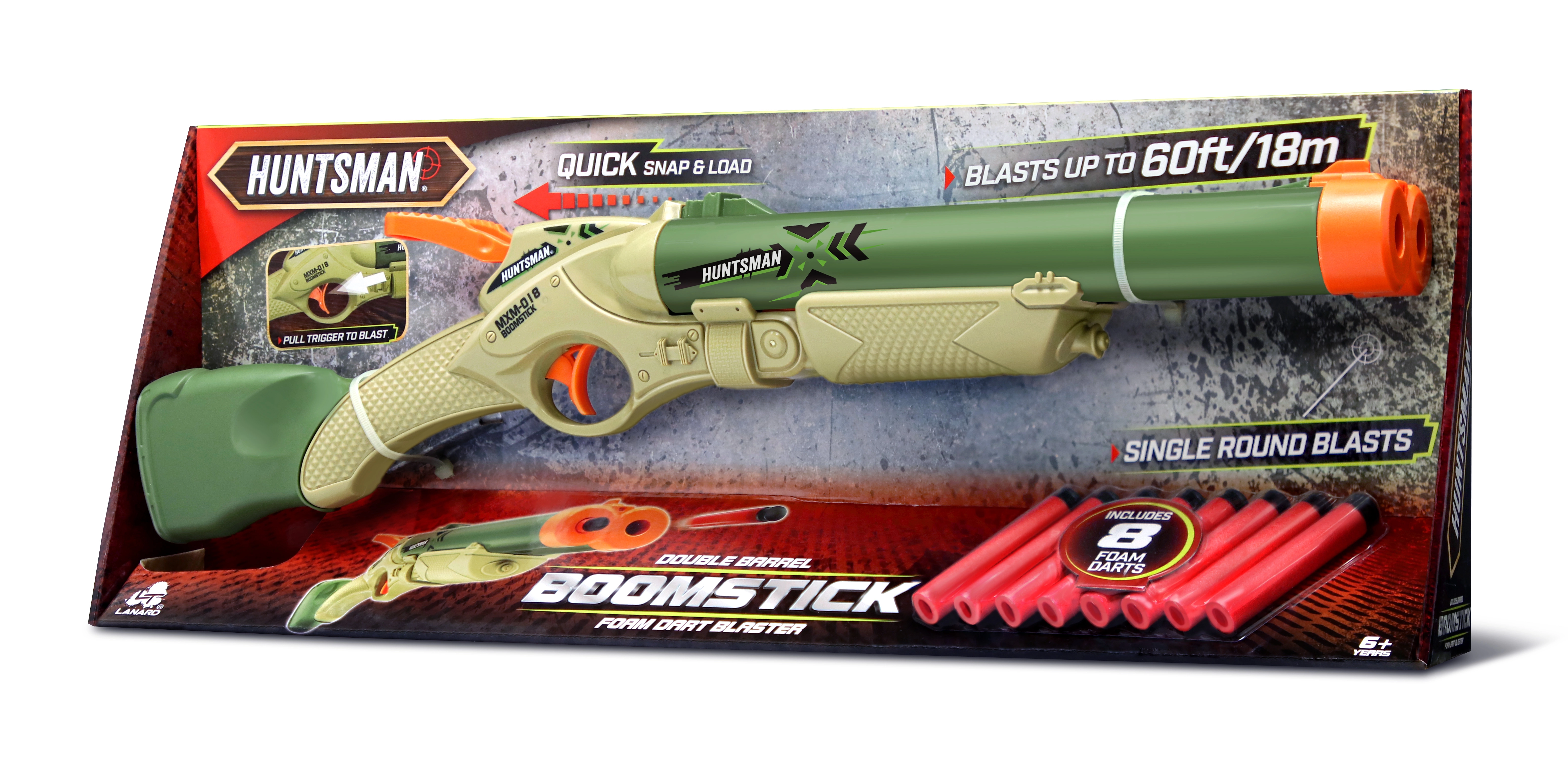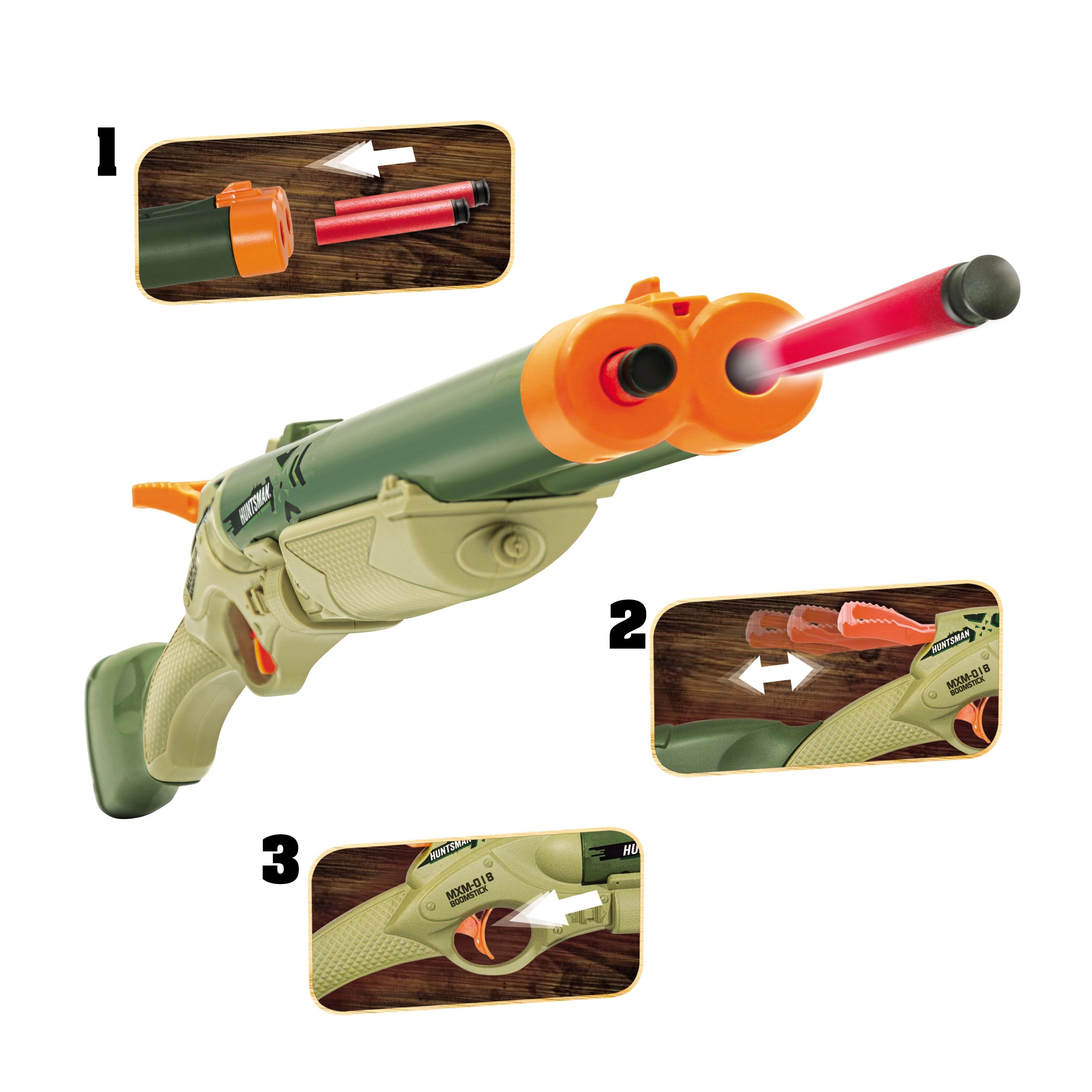 Запознайте се с пушката Huntsman BOOMSTICK, създадена за деца, жадни за действие и приключения. Тази съкратена двуцевна пушка прави играта реалистична и забавна: