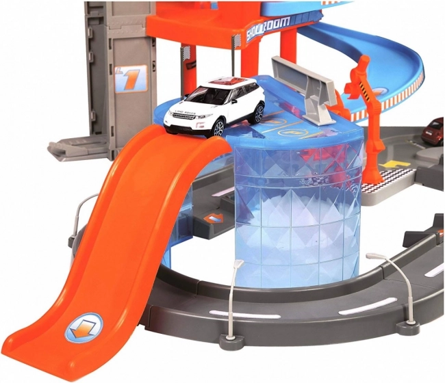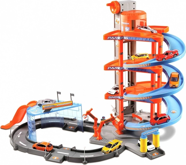 Този цветен гараж Bburago STREET FIRE Mega Dealer showroom е идеален за креативна детска игра. Децата издигат количката с асансьора до най-горния етаж и се спускат по спиралите, спират в сервиза, минават през автомивката и паркират на обозначените места. Благодарение на лесно сглобяемите пластмасови части сглобяването и прибирането е детска игра.