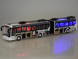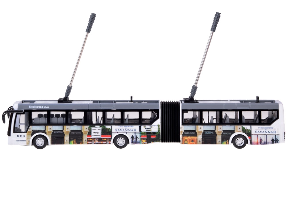 Открийте забавлението със съчленения тролейбус, който правдоподобно пресъздава градския транспорт – включително токоснематели и детайлен страничен печат. Предните LED и мигащите червени и сини светлинни ефекти добавят автентичност, а съчленената конструкция осигурява плавно завиване и в по-тесни пространства.