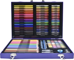 В комплекта ще намерите 128 елемента, включително цветни моливи, пастели, восъчни пастели, бои, четка, линия, гума и острилка. Комплектът подпомага креативното изразяване, развитието на въображението и фината моторика. Подходящ е за деца от 3 години и отговаря на стандартите за безопасност CE и EN71.