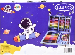 Пълен художествен комплект за деца, който съдържа 128 части в елегантно синьо куфарче с мотив космонавт. Предлага всичко необходимо за рисуване и оцветяване: моливи, пастели, темперни бои, четка, линия, гума и острилка. Идеален за развитие на креативността и фината моторика, чудесен подарък за малките творци.