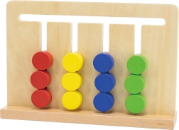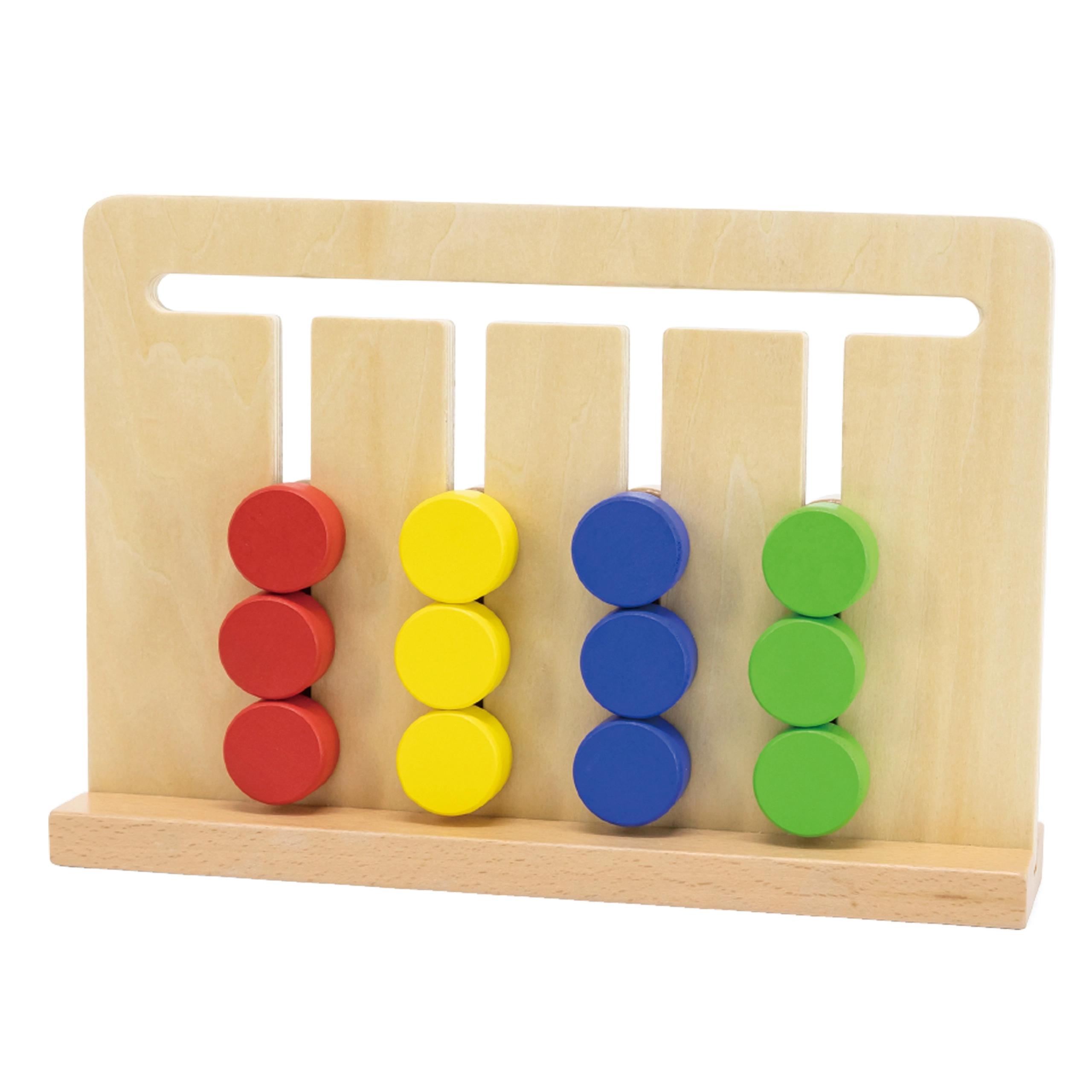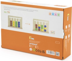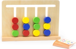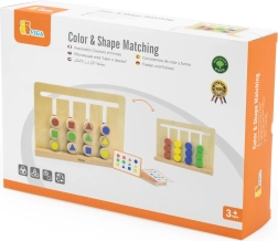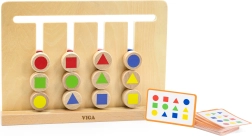 Дървена логическа игра от VIGA учи децата от 3 години да разпознават цветове и форми, да планират стъпки и да се концентрират. По 4 релси децата придвижват 12 двустранни блокчета според 16 двустранни карти. Две нива на трудност (цветове → форми) осигуряват продължително и смислено забавление в духа на Монтесори.