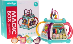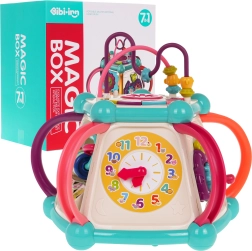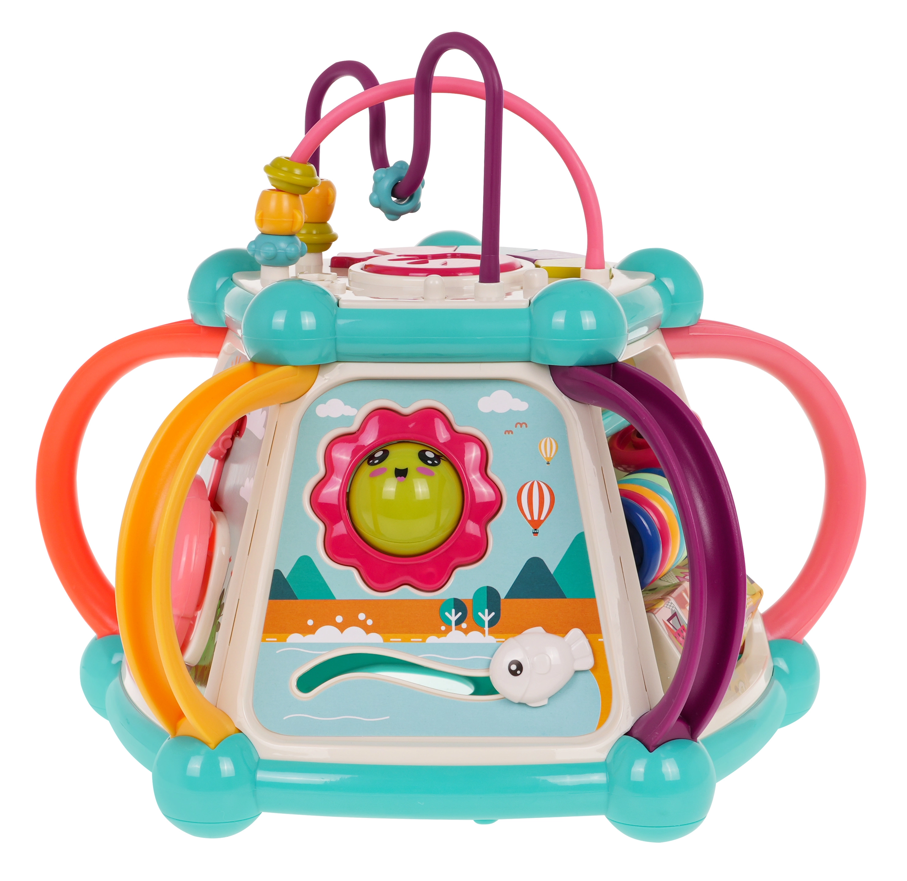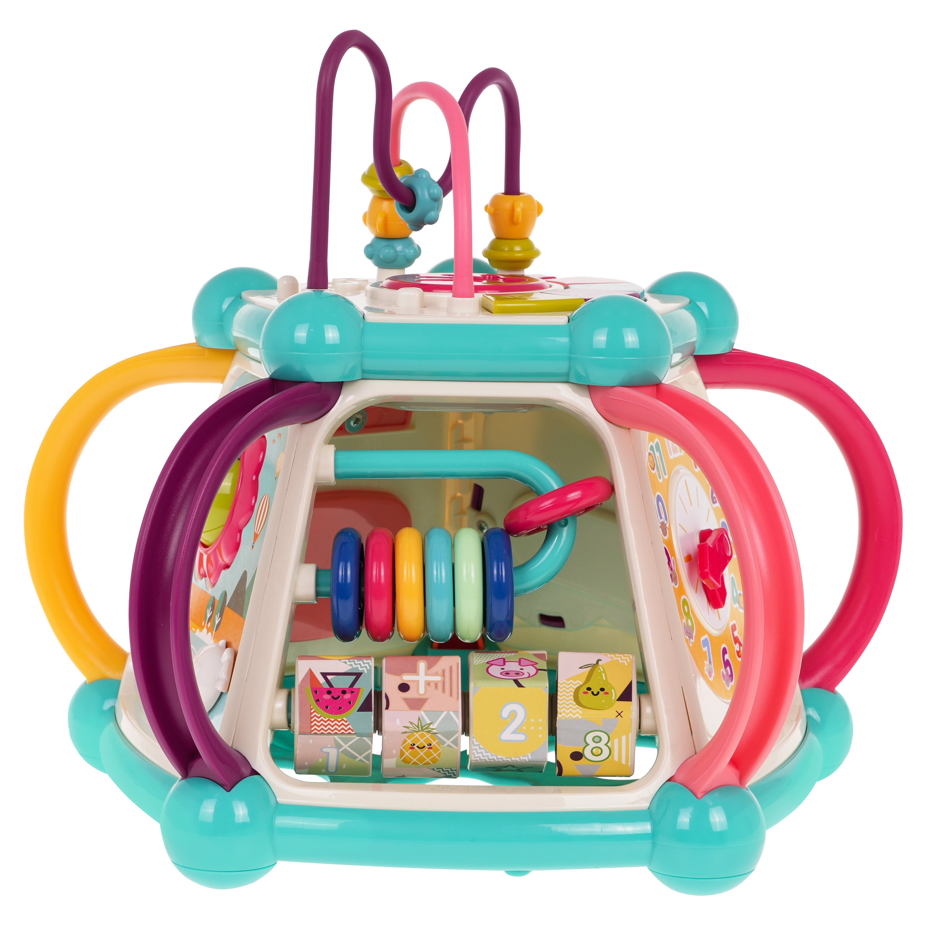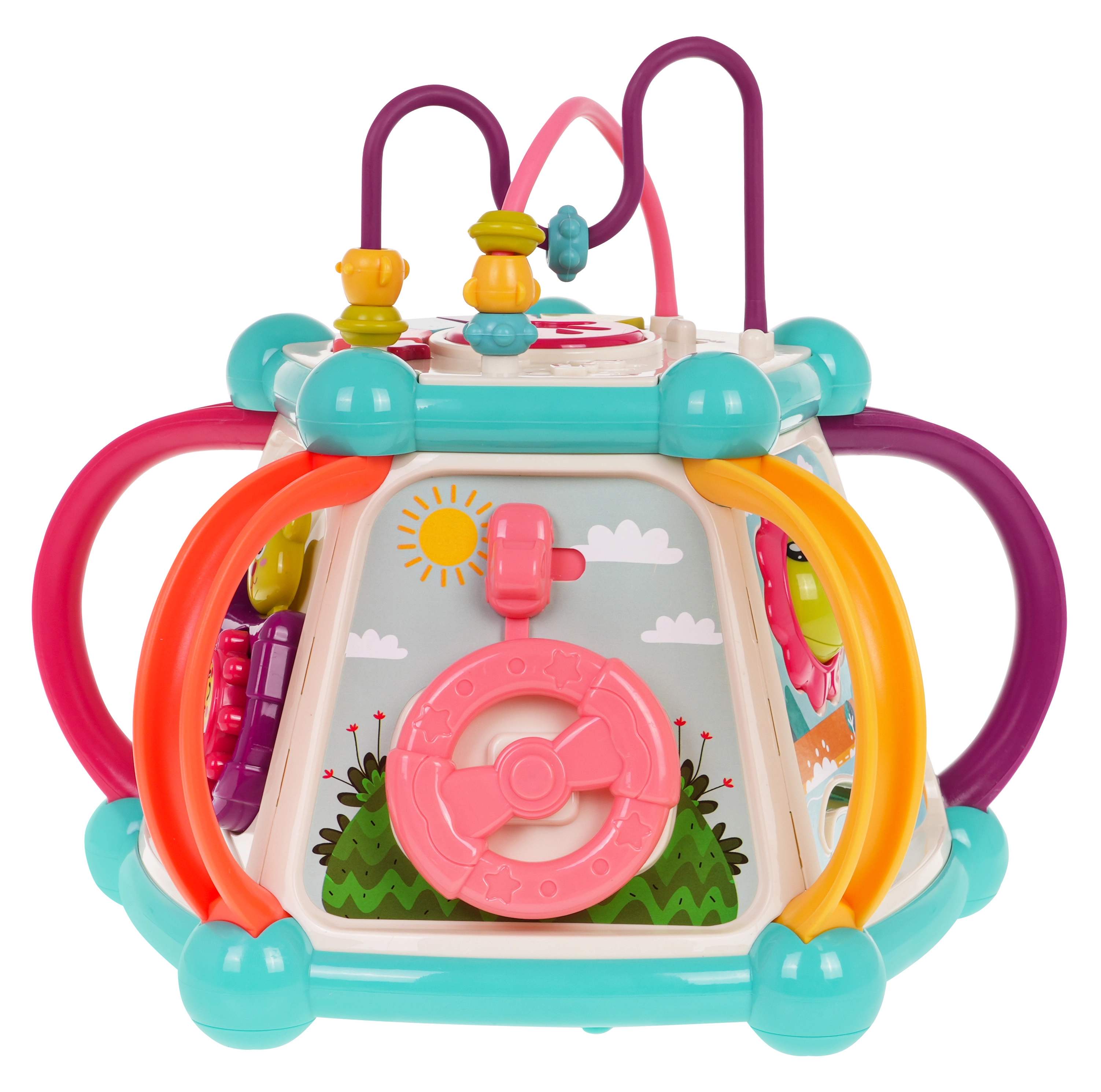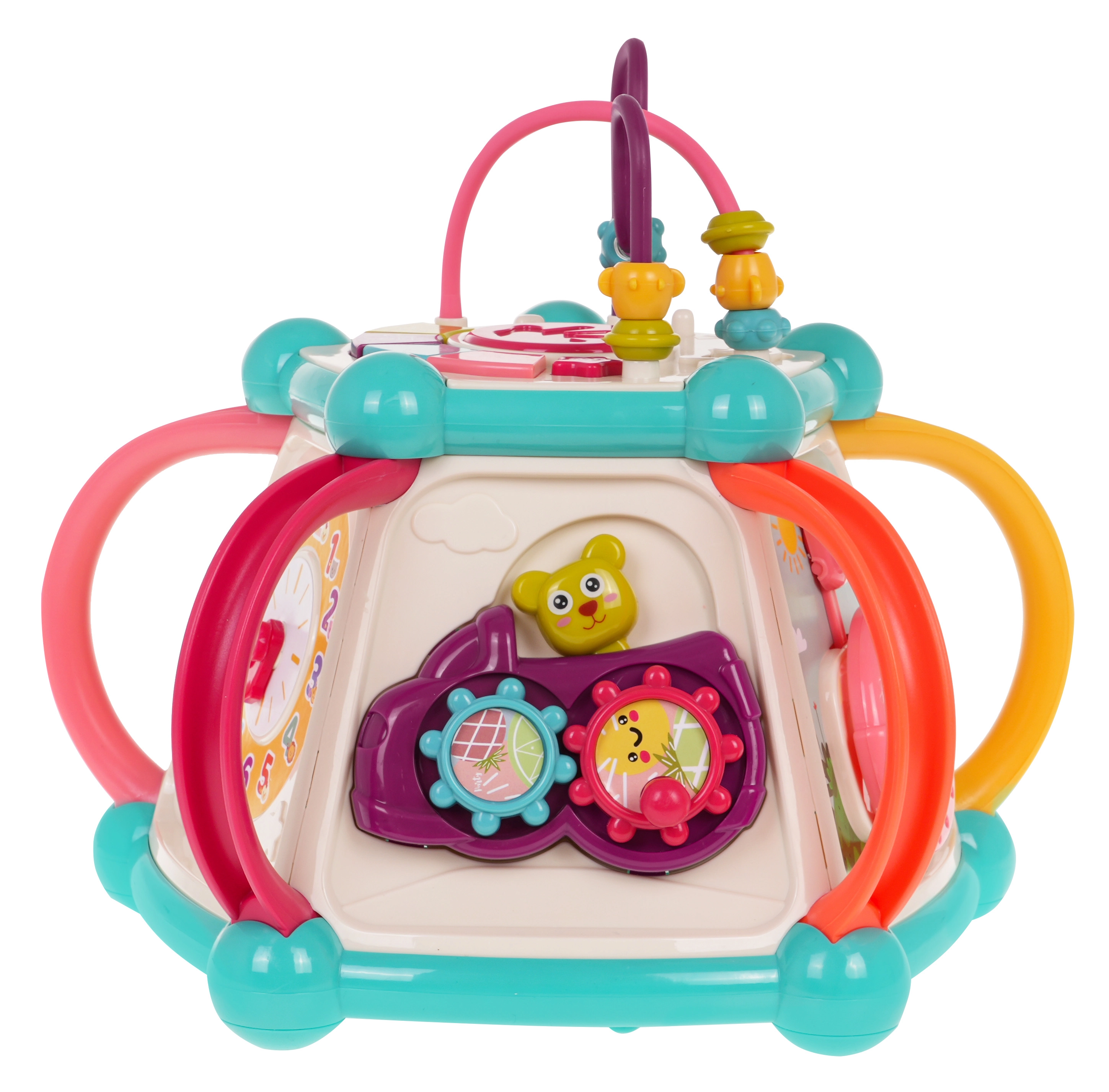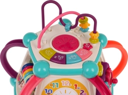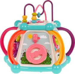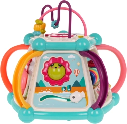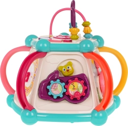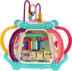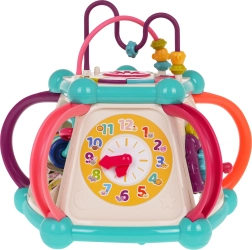 Това цветно многофункционално кубче е изработено от висококачествен, безопасен пластмасов материал и е идеално за първите открития на света. Седемте игрови повърхности предлагат разнообразни активности: горен панел с въртележка, двустепенно регулиране на звука и пиано със звуци на кученце, котенце, овчица и патенце, странични панели със сметало, часовник със стрелки, зъбни колела и меченце, волан с количка и забавна рибка със слънчице. Долната страна крие отвор за сортиране на форми и 6 цветни кубчета.