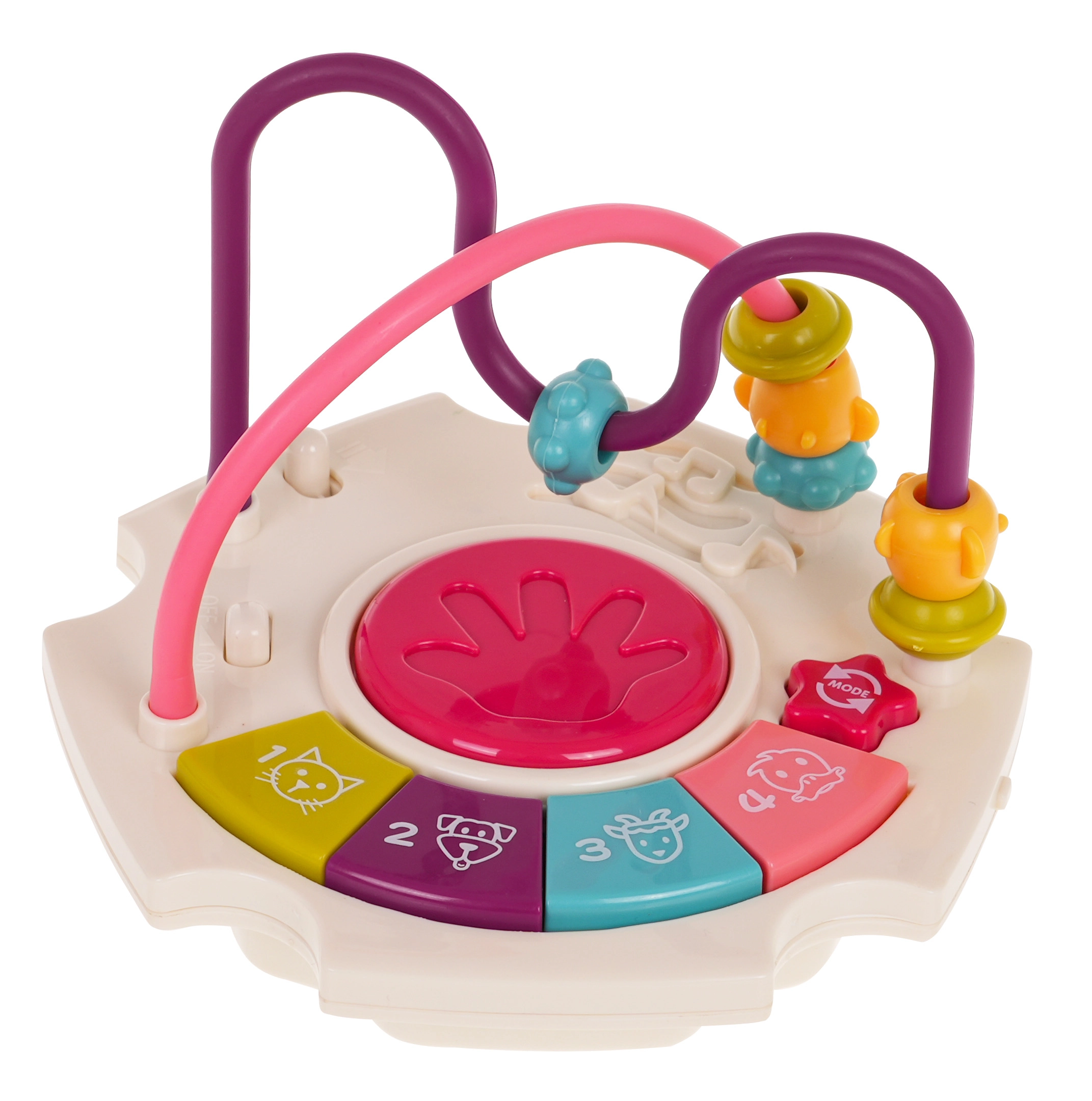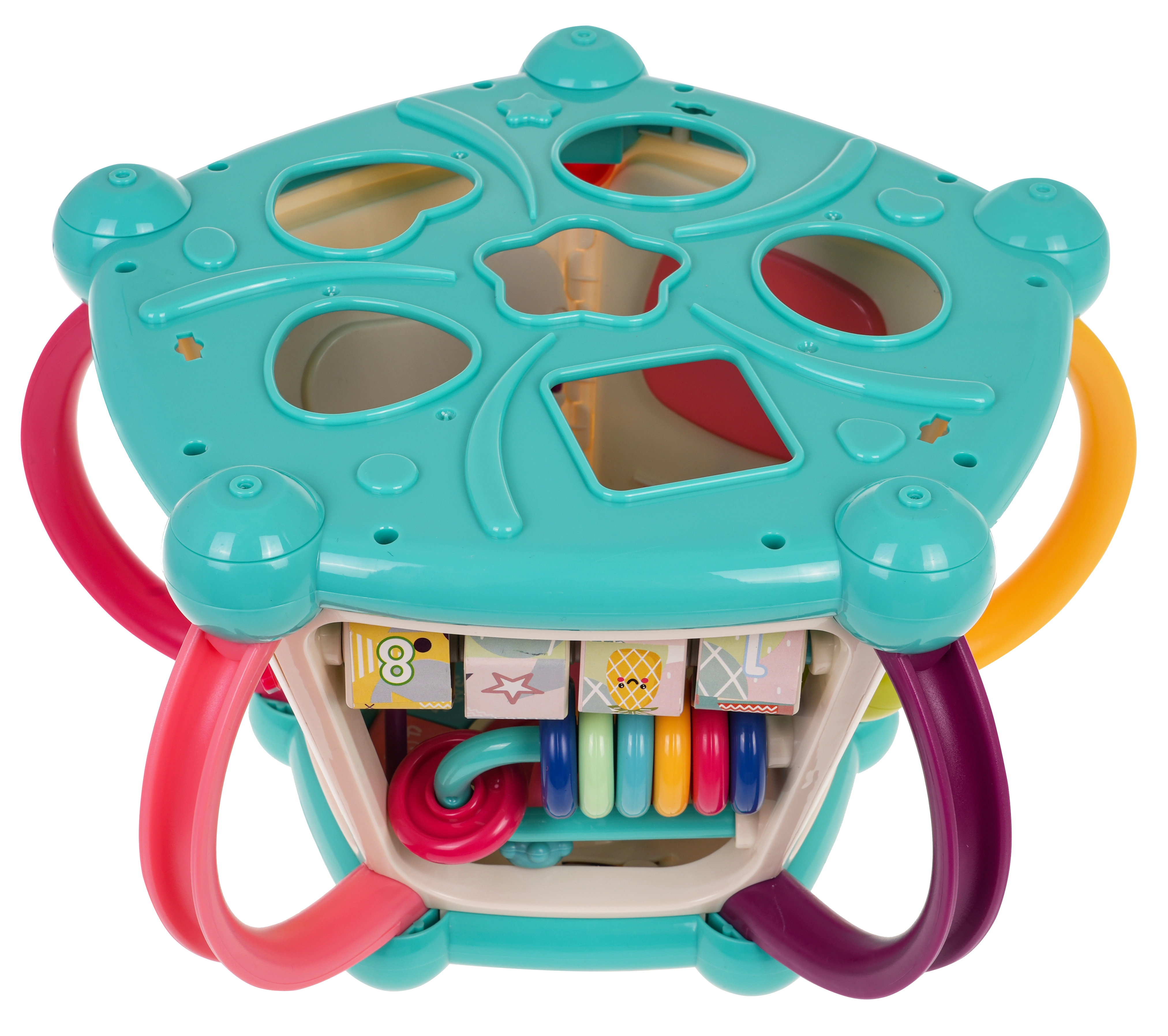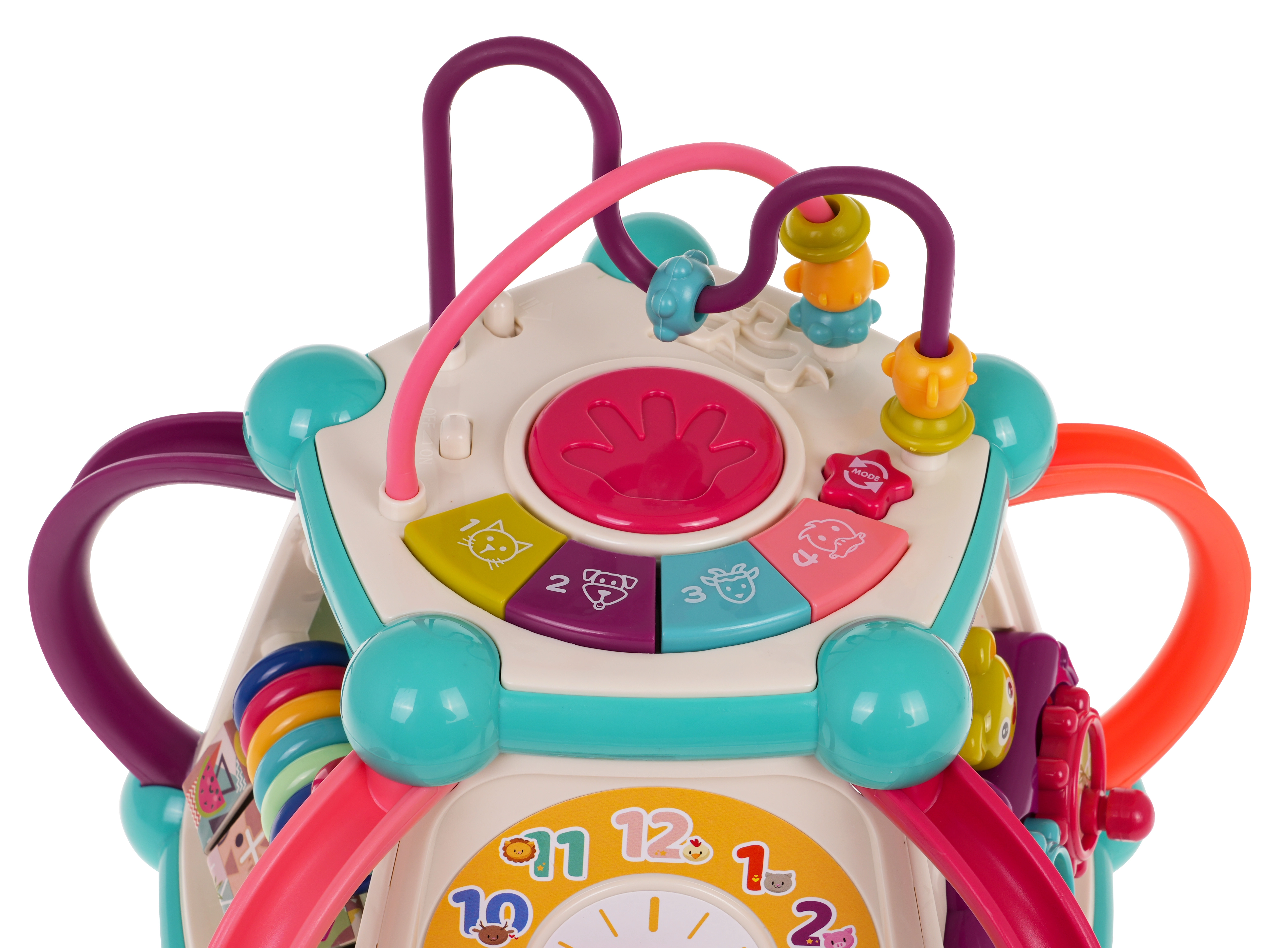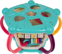 Горен панел с въртележка и пиано, сметало, часовник, зъбни колела с меченце, волан с количка, рибка със слънчице и долен сортер за форми.