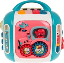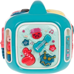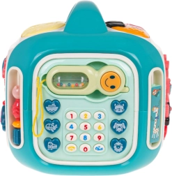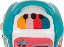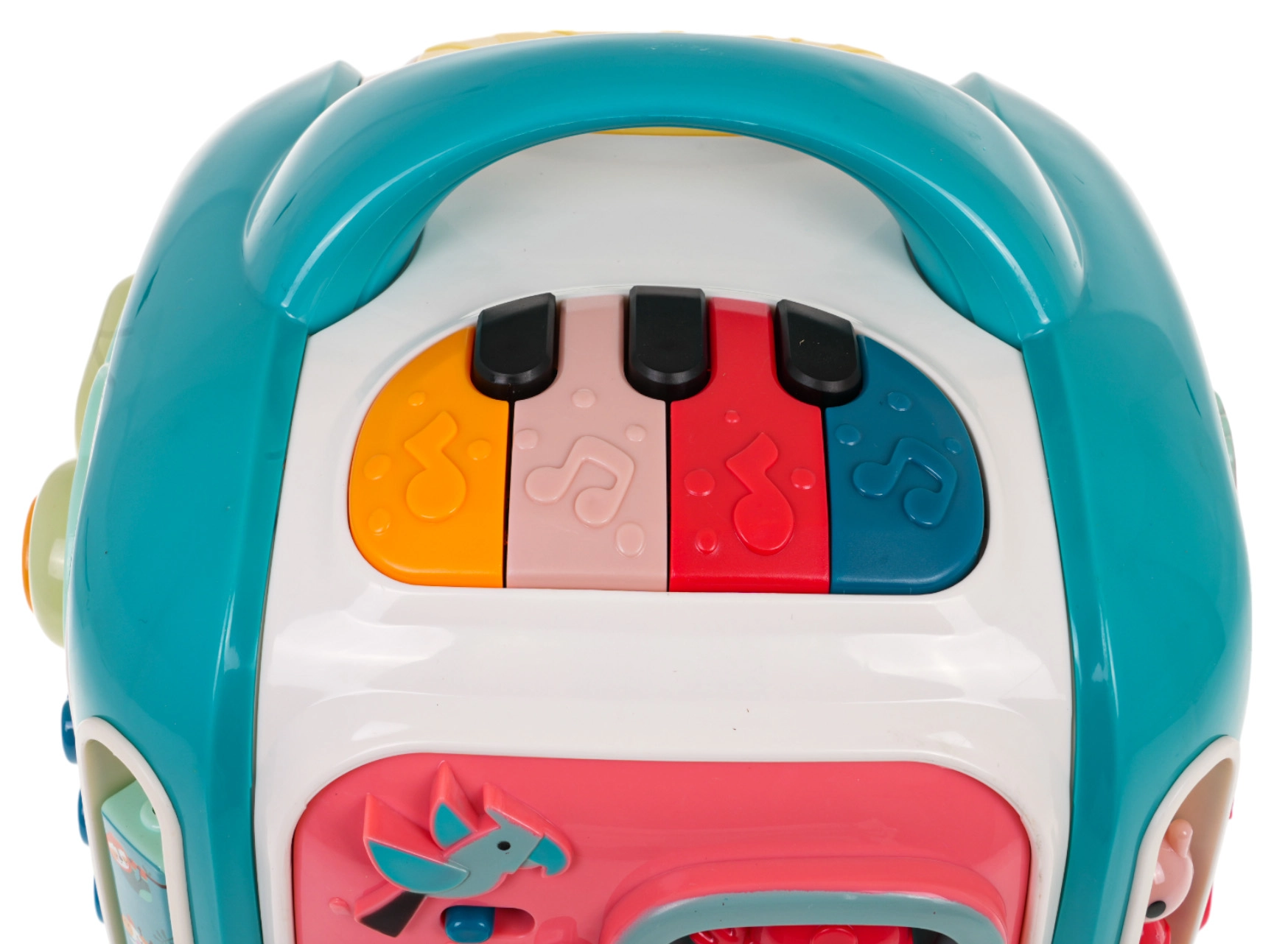 Интерактивната кубче-играчка е създадена за забавление и учене. Децата откриват цветове, форми, названия на животни и транспорт, тренират пръстчетата на въртящи се елементи и изследват различни мелодии и звуци. Горният панел с пиано предлага 3 режима и чувствителни клавиши за лесна игра.