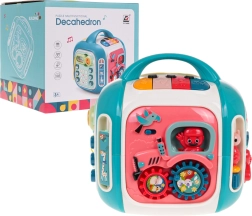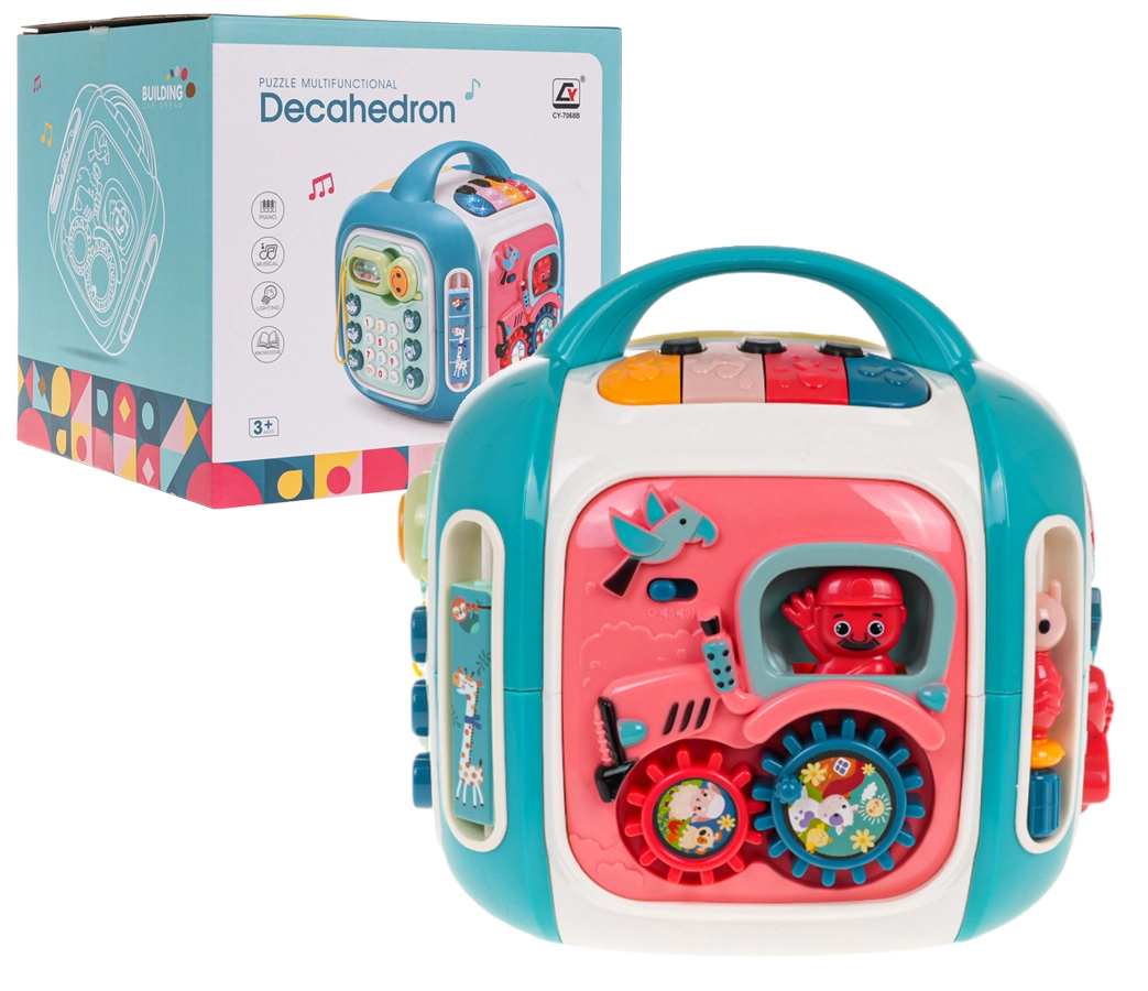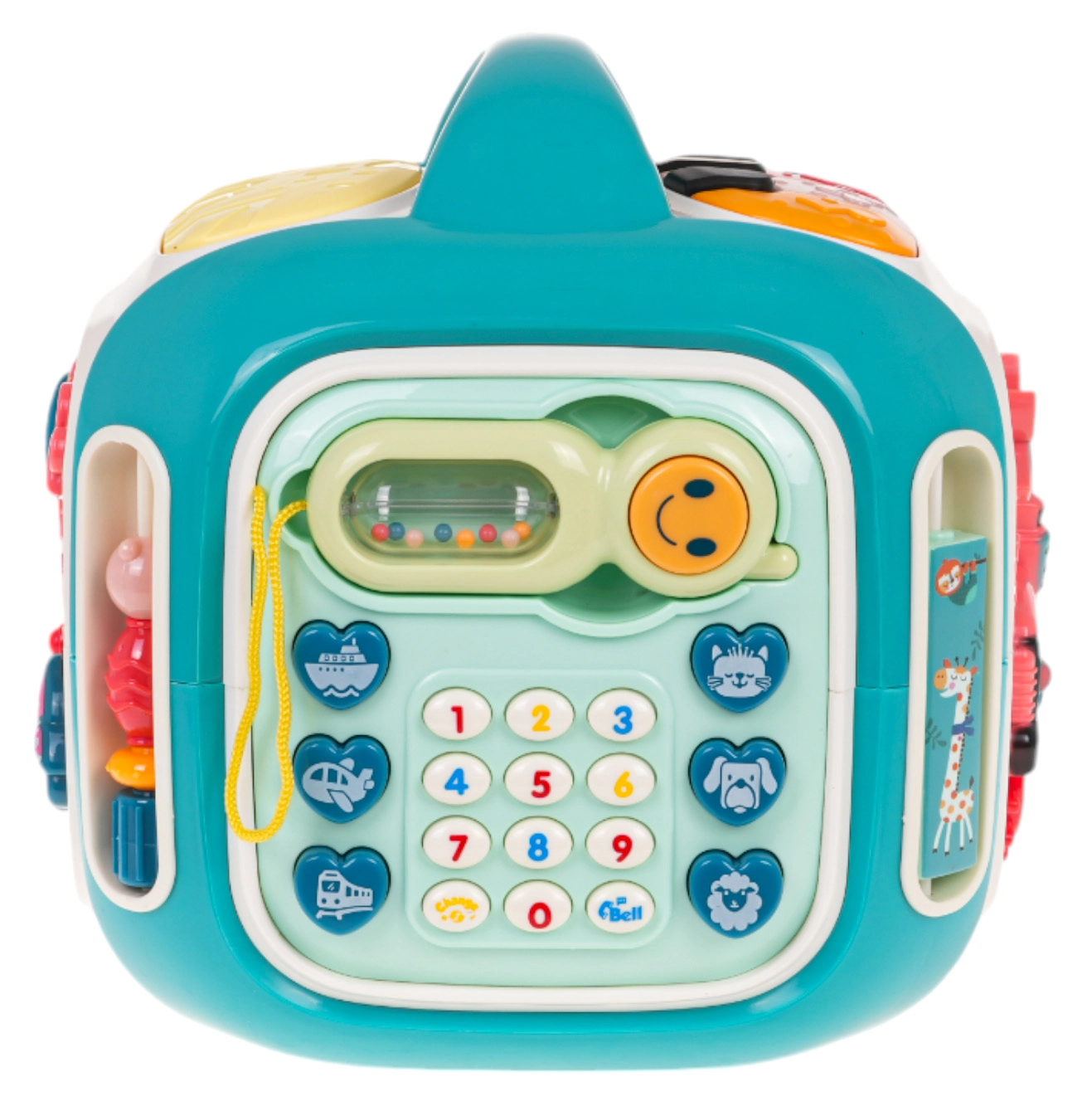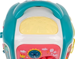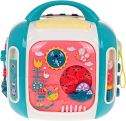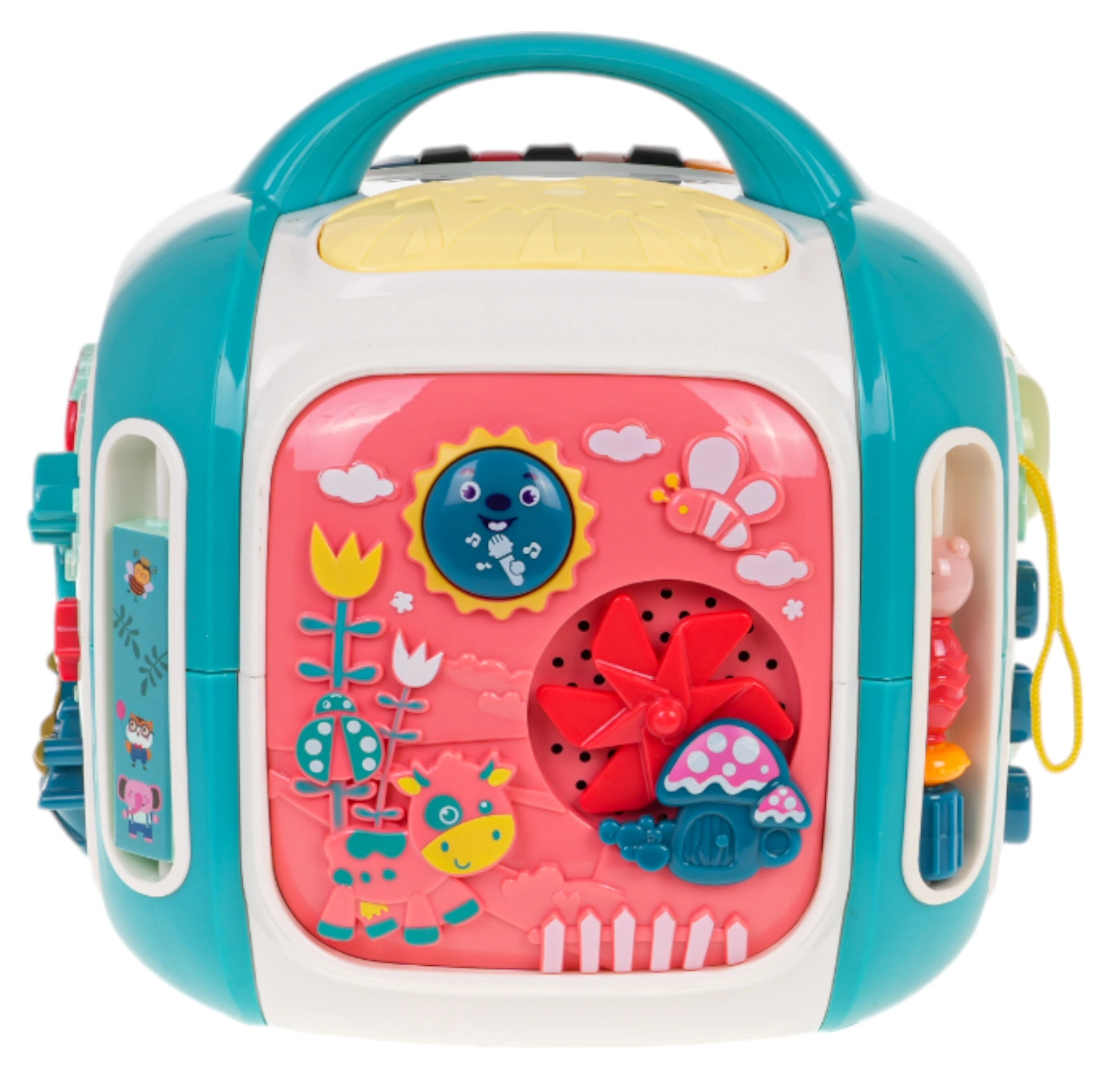 Пъстра интерактивна кутия с богати светлинни и звукови ефекти забавлява децата от 3 години за дълги часове. Всяка страна предлага различни активности – мини пиано, музикални инструменти, телефон с числа и животни, въртящи се зъбни колела и вятърниче и слънчице. Практичната дръжка улеснява пренасянето, а качествената пластмаса в ярки цветове подпомага развитието на сетивата и фината моторика.