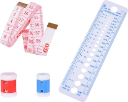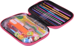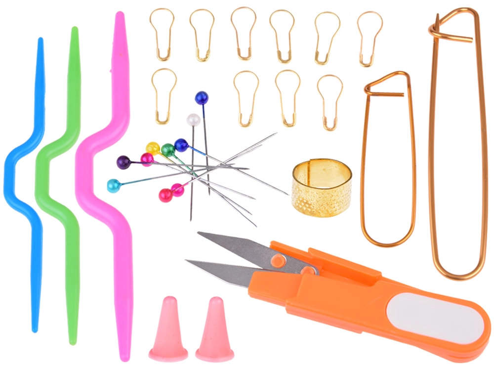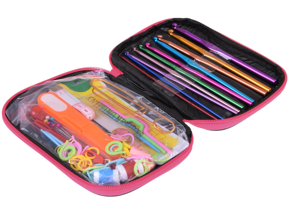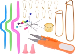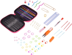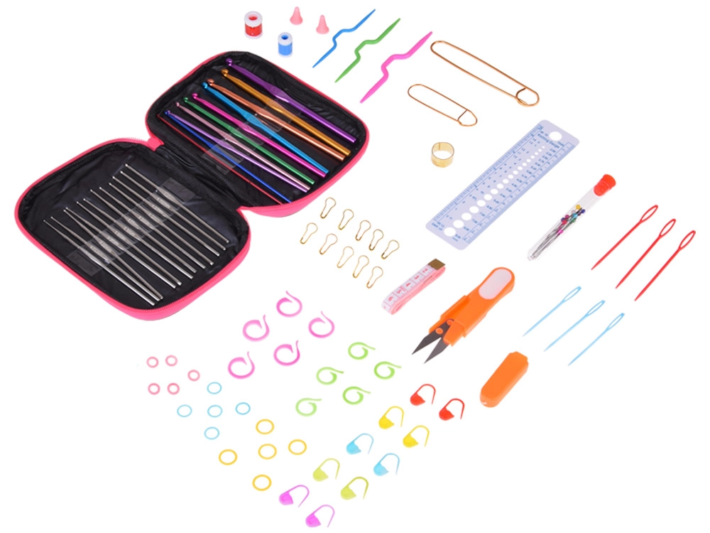 Комплектът включва всички допълнения, необходими за плетене на една кука – метър, предпазни ножички, игли, карфици, сантиметри, напръстници и много други, за да творите с професионален завършек.