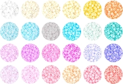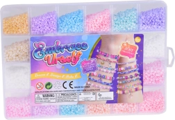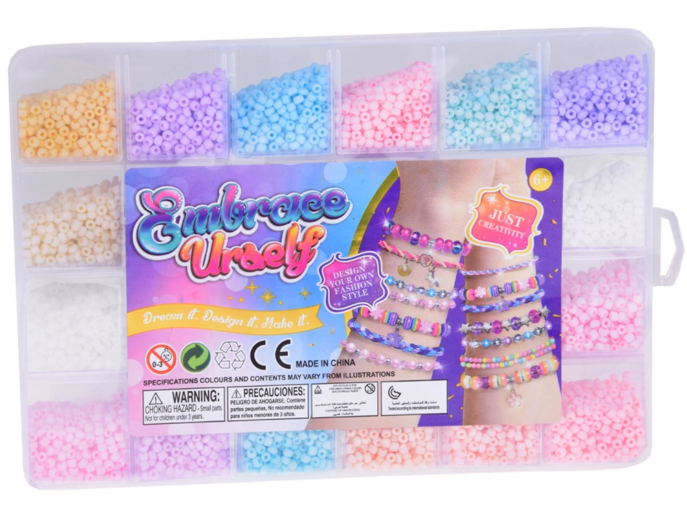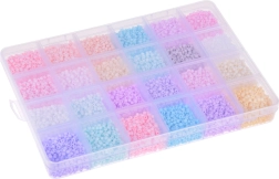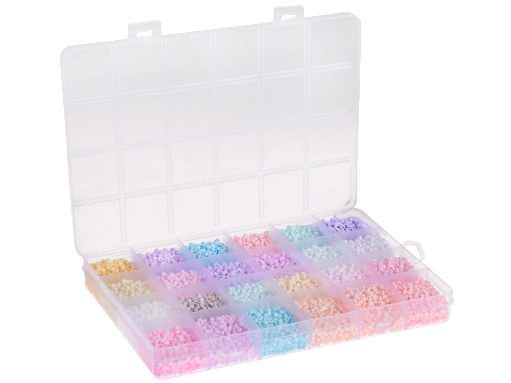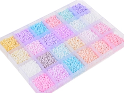 Включва 24 различни пастелни цвята мъниста: розови, лилави, сини, бежови, зелени, бели и жълти. Те са подредени в прозрачен, удължен контейнер, практично разделен на отделения. Така се предотвратява смесването на мънистата и се улеснява тяхната организация.