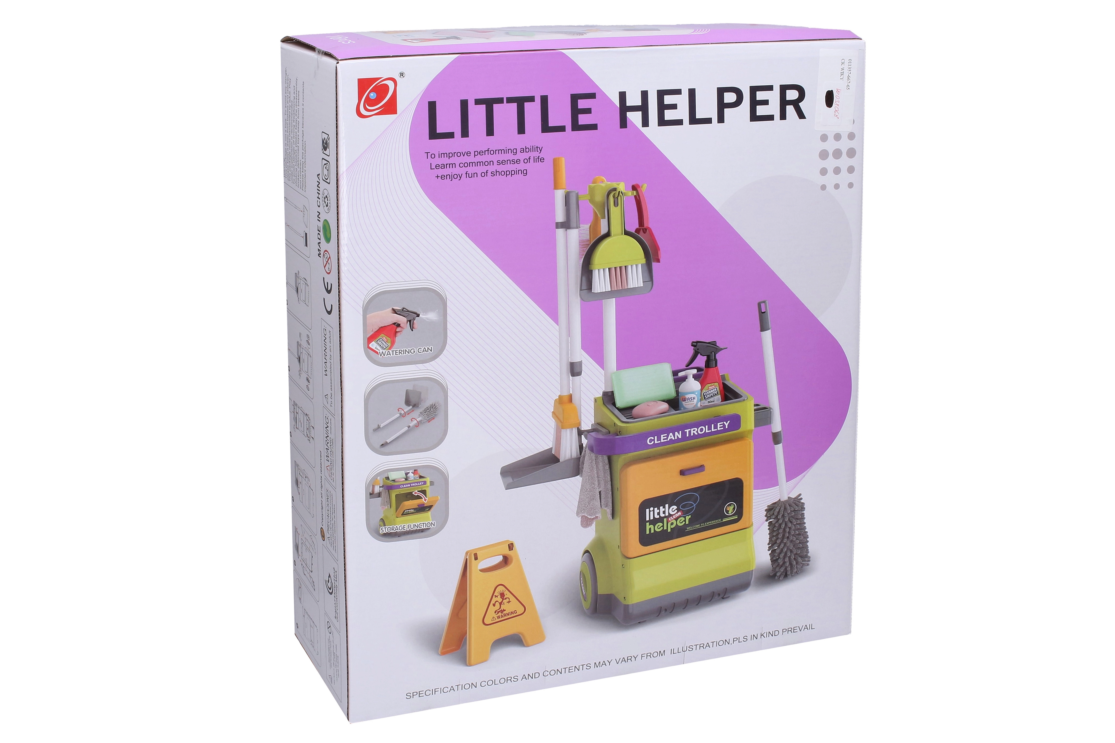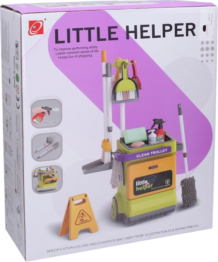 Комплектът за почистване с количка за малки помощници в домакинството съдържа всичко необходимо за игра „на почистване“. Благодарение на богатото оборудване и реалистичните аксесоари децата ще се забавляват с часове, като едновременно развиват моториката и отговорността си. Включени са метли, четка за метене, лопатки, перушина за прах, стъклочистач, както и „почистващи средства“ за още по-автентично изживяване.