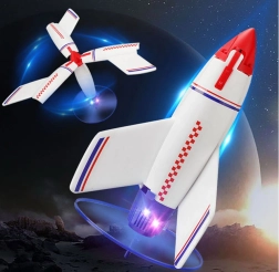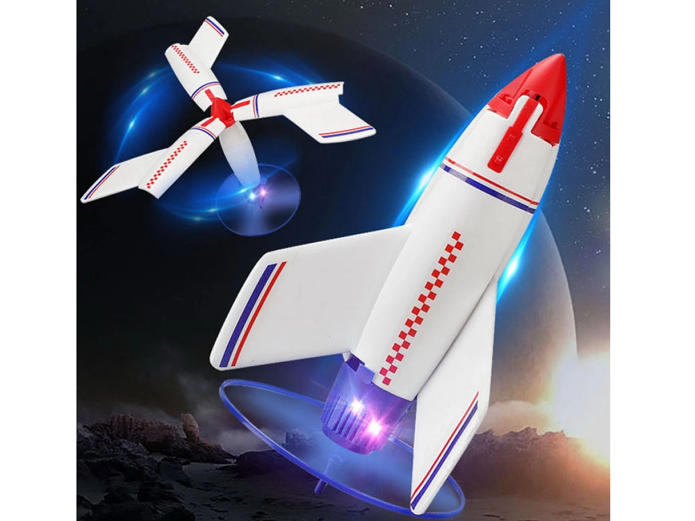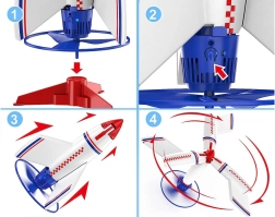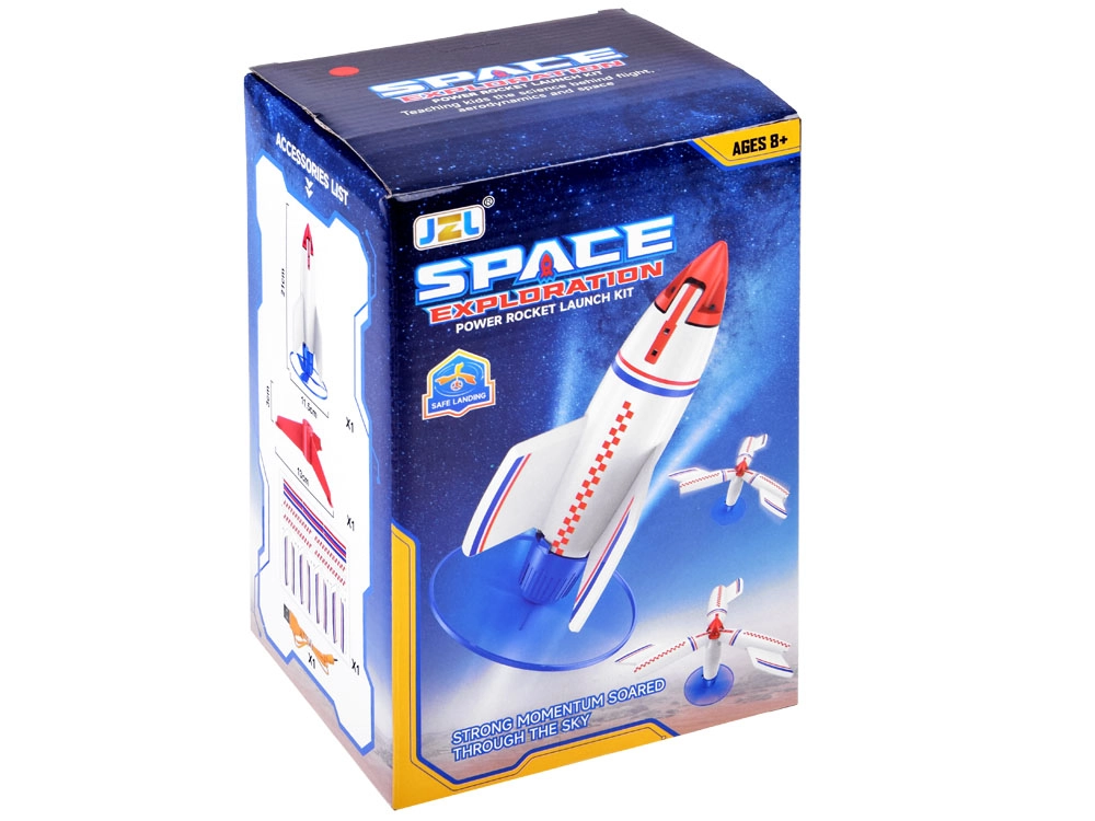 Тази лека и издръжлива ракета комбинира пластмасова рамка с мека пяна за по-безопасна употреба. При спускане крилата се отварят автоматично и действат като парашут, осигурявайки стабилно и меко приземяване. Стартирането е лесно – достатъчно е да поставите ракетата върху стартовата платформа и да я задействате с бутон или с дистанционното.