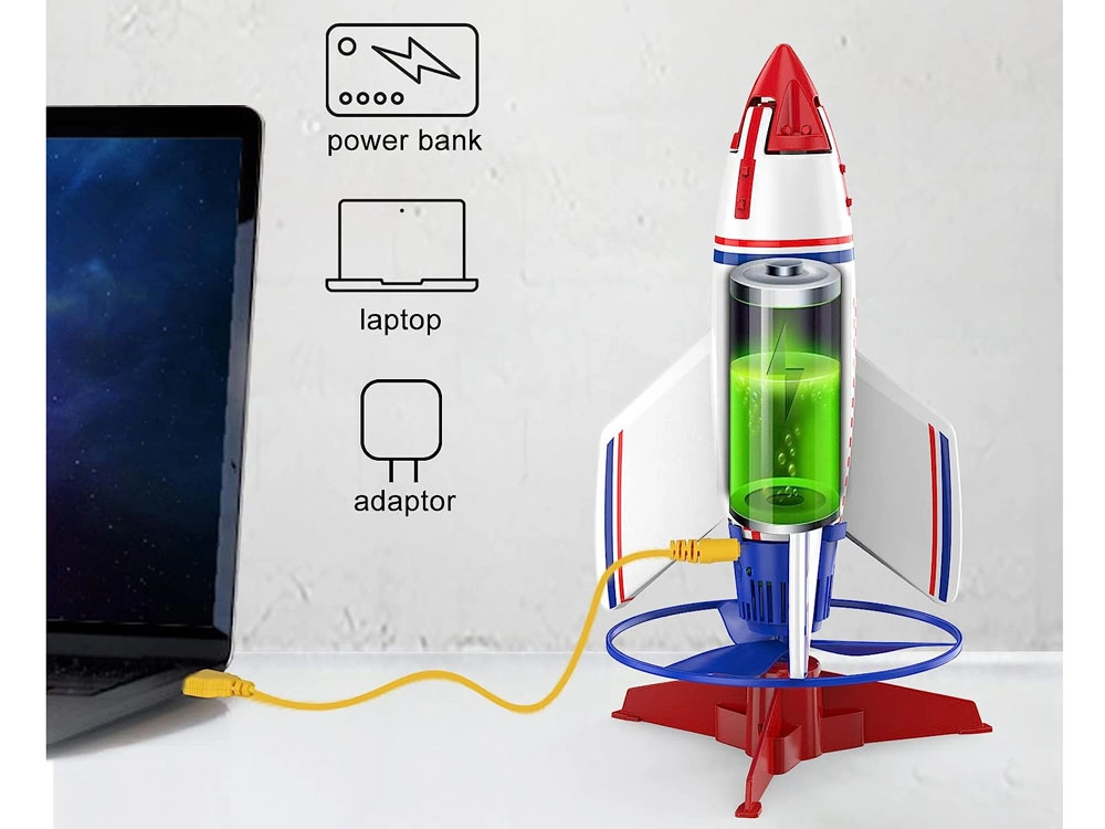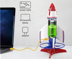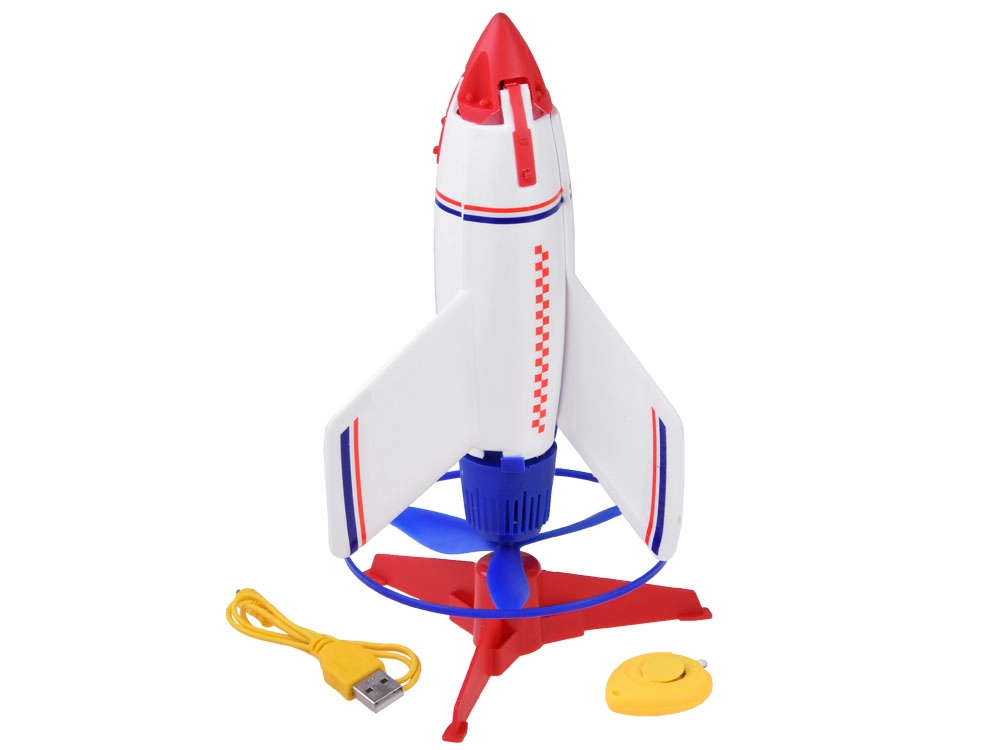 - Ракета с вграден акумулатор, стартова платформа, дистанционно управление, батерия CR1220 за дистанционното, USB кабел за зареждане, стикери