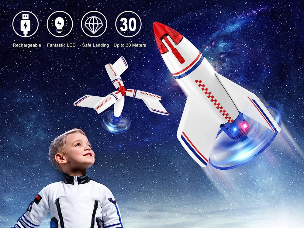 Открийте забавлението с летящата ракета, която излита до височина около 30 метра и след това автоматично каца благодарение на разгъващите се крила. В комплекта са включени стартова платформа, дистанционно управление, вграден акумулатор и USB кабел за зареждане – идеално за външни приключения на малките астронавти.