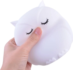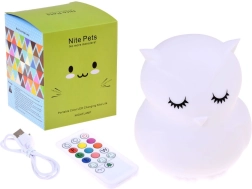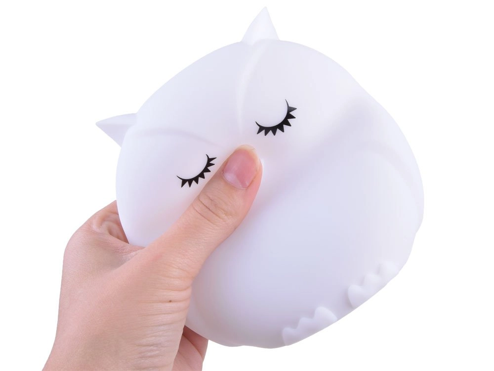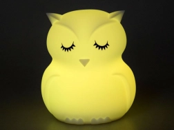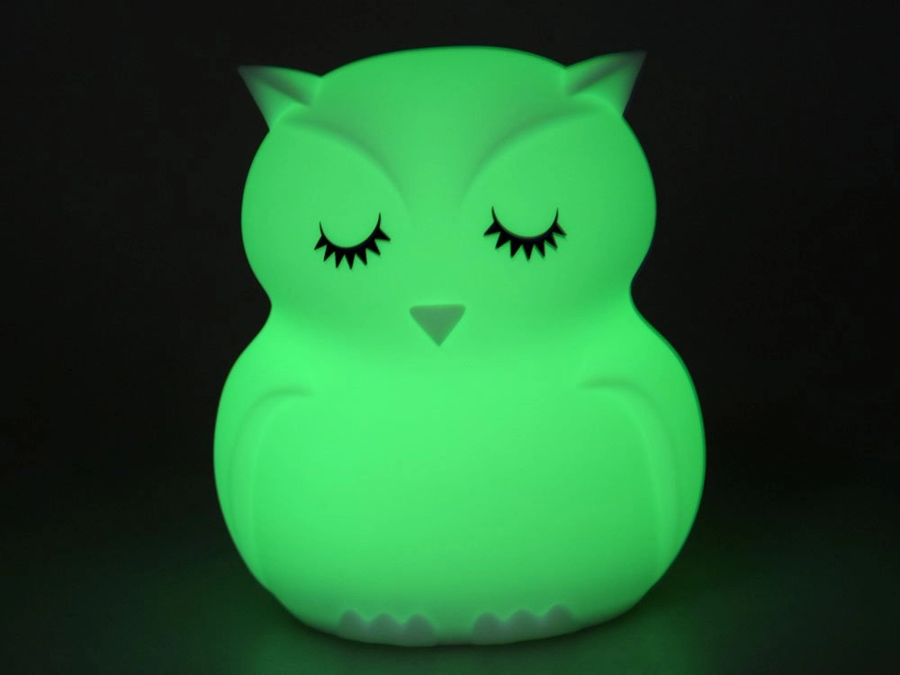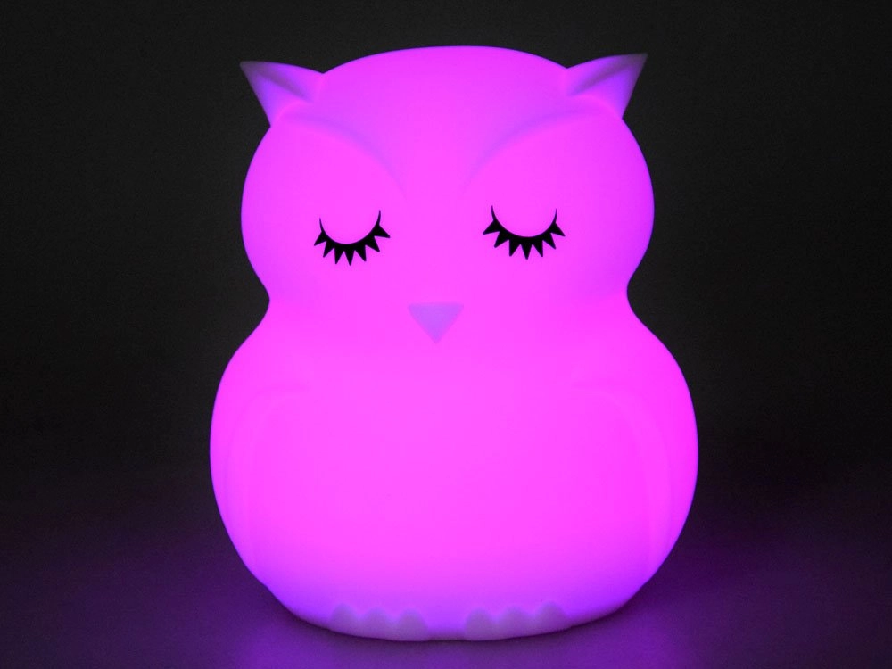 Тази детска нощна лампа бухал от мек и безопасен силикон нежно озарява тъмнината и помага да прогони нощните страхове. Предлага 9 цвята, включително бял, червен, жълт, розов, зелен, син, оранжев, тъмносин и лилав. Цветовете се сменят с докосване директно на лампата или удобно с дистанционно управление.