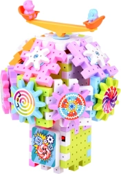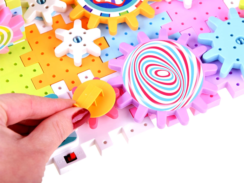 Сглобяемият комплект съдържа зъбни колела и малки лопатки с животни, които могат да се въртят, като по този начин развиват координацията и умението за решаване на проблеми.