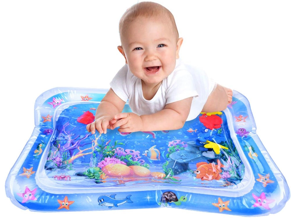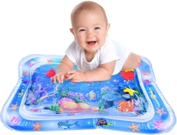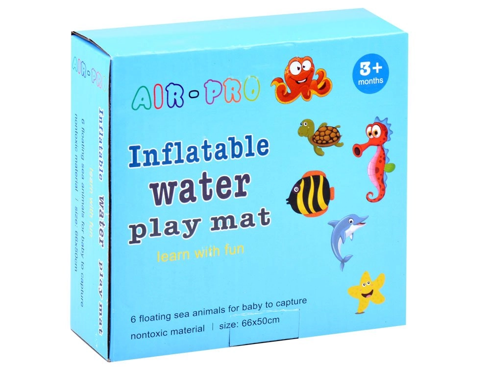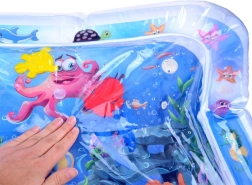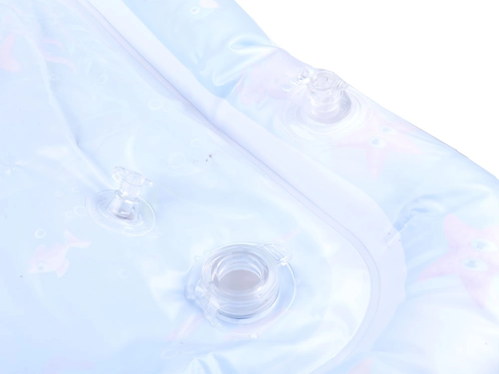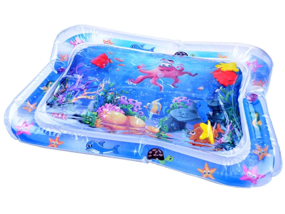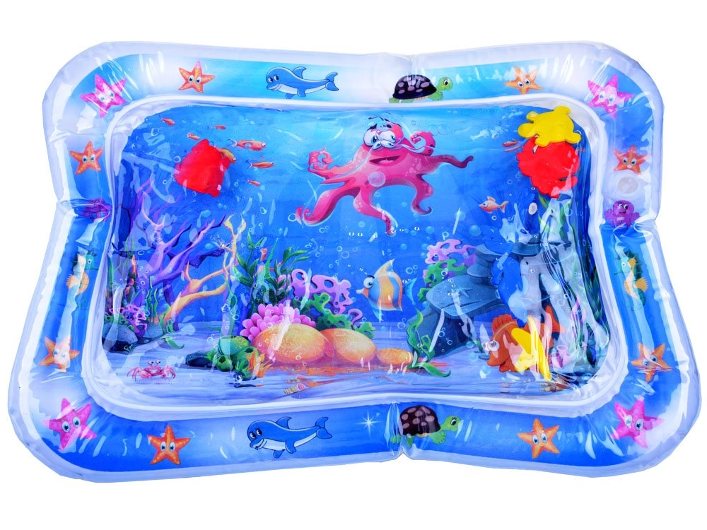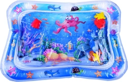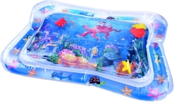 Тази водна игрова постелка е изработена от висококачествен пластмасов материал. След надуване на ръба и напълване на центъра с вода вътре свободно се движат плуващи елементи с океански мотив, които привличат вниманието на детето и го насърчават да изследва. Постелката е идеална за лежане по корем, укрепва мускулите на врата, раменете и гърба и естествено подпомага правилното моторно развитие.